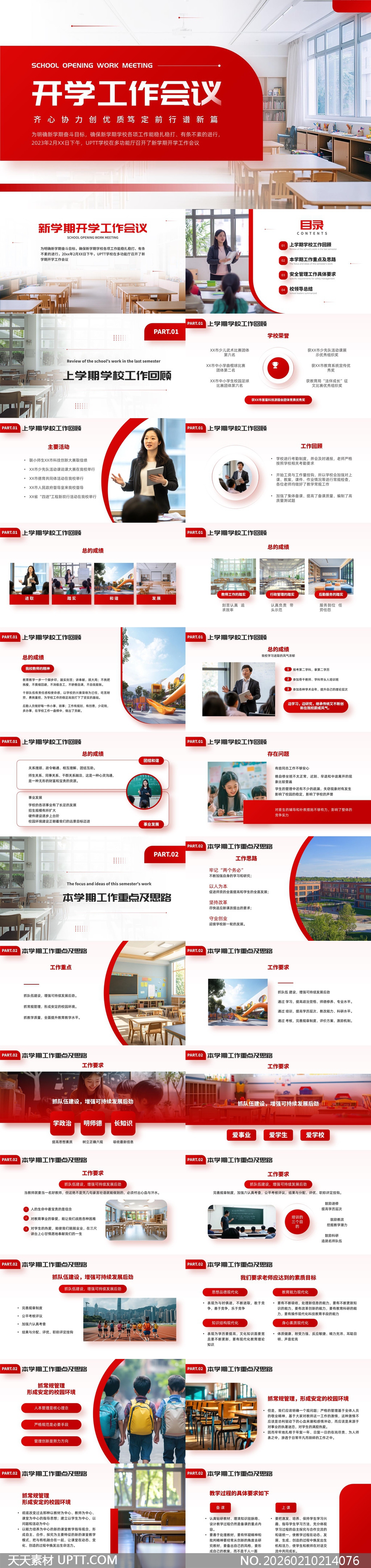 本模板采用鲜明红色主调搭配留白与圆角几何元素,内含工作回顾、重点部署、问题分析与目标规划等逻辑清晰的模块化页面,适配学校开学工作会议、学期总结汇报及行政述职等场景;图文并茂的设计融合真实校园实景与专业插图,兼顾教育行业规范性与现代审美需求,助力高效呈现办学成果与新学期战略方向。【 素材唯一编号 20260210214076 】,简约类红色风格PPTX格式素材下载,文件格式为.PPTX,下载完成后的文件为一个压缩包,素材压缩包大小25.07 MB,请解压后用相应软件打开。