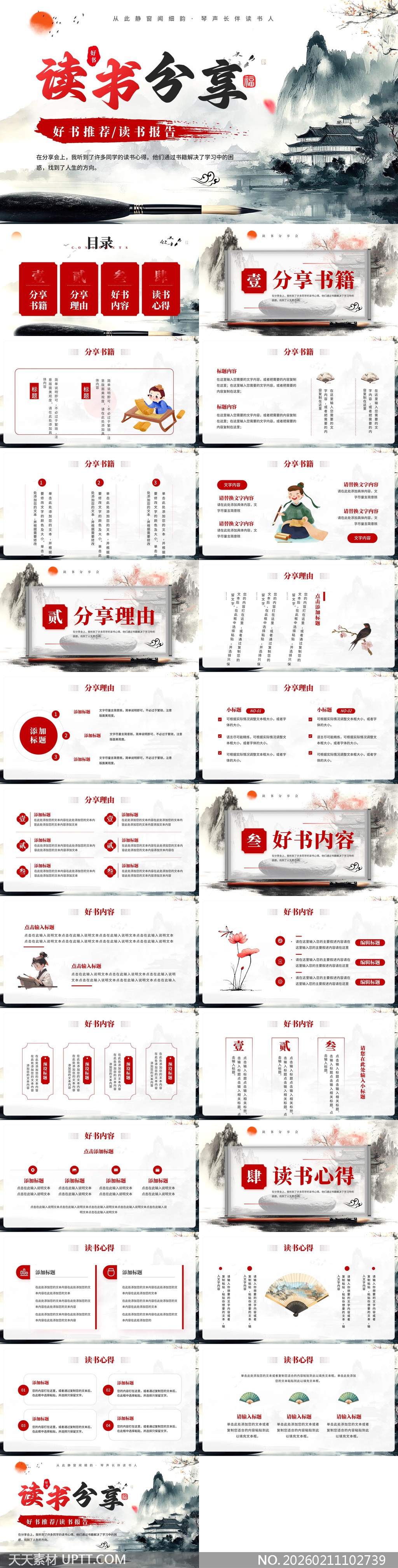 本模板以水墨丹青为视觉基调,融合山水、古建筑、毛笔、折扇等传统元素,营造静谧雅致的东方美学氛围;结构清晰分为书籍推荐、分享缘由、内容精要与阅读心得四大模块,适配校园读书会、企业阅读沙龙、图书馆推广活动及语文教学汇报等场景,既彰显文化厚度又兼顾实用功能,助力用户高效呈现深度阅读成果与思想感悟。【 素材唯一编号 20260211102739 】,中国风类红色风格PPTX格式素材下载,文件格式为.PPTX,下载完成后的文件为一个压缩包,素材压缩包大小14.84 MB,请解压后用相应软件打开。