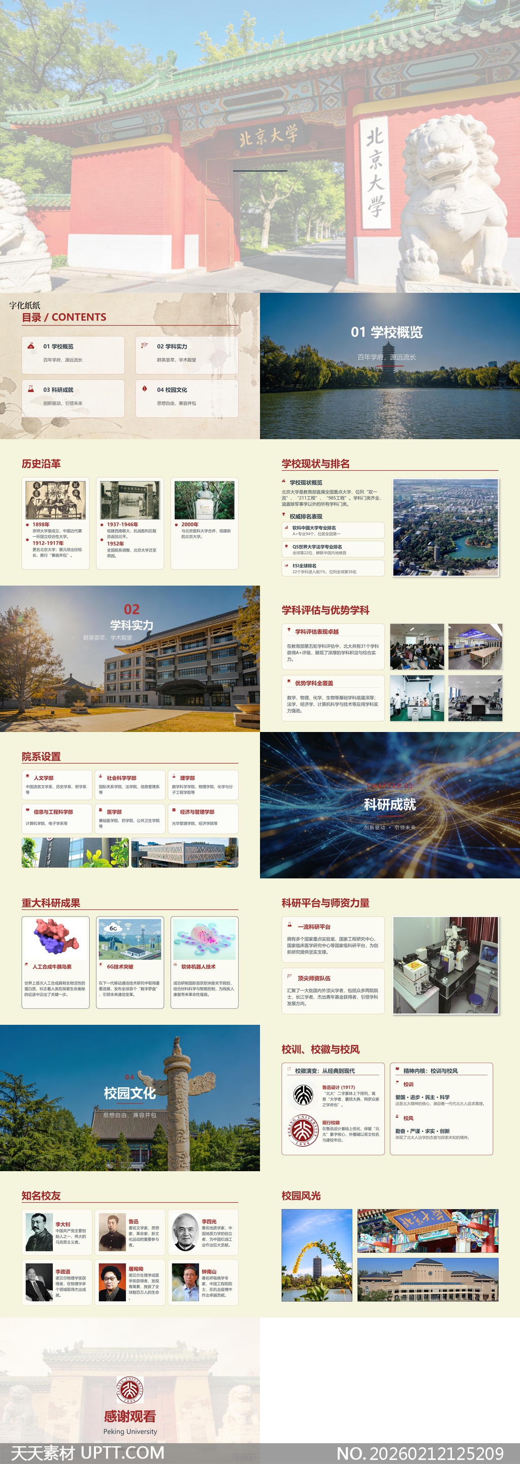 本PPT模板以典雅中国风与现代设计融合,采用北大标志性建筑实景图、历史影像与科技感视觉元素,分为学校概览、学科实力、科研成就与校园文化四大模块,适配高校宣传、招生推介、学术汇报及校史教育等场景,素材高清可编辑,兼顾庄重性与传播力,助力高效呈现北大百年积淀与时代风采。【 素材唯一编号 20260212125209 】,中国风类红色风格PPTX格式素材下载,文件格式为.PPTX,下载完成后的文件为一个压缩包,素材压缩包大小14.11 MB,请解压后用相应软件打开。