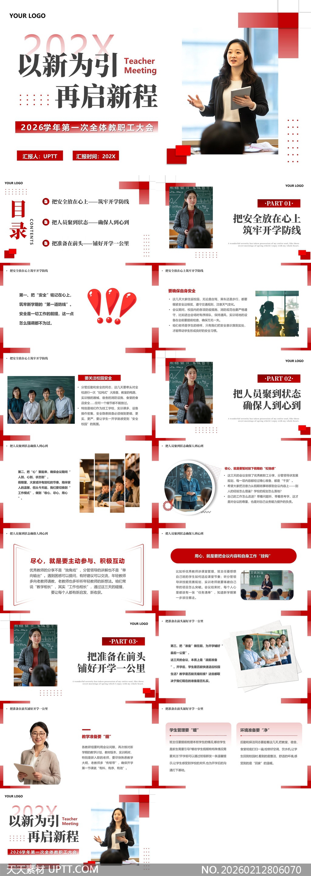 本PPT模板采用红白主色调搭配简约几何构图,视觉清爽专业,内含“安全防线”“人员状态”“开学准备”;适用于中小学及高校新学年教职工动员大会、安全培训与教学部署会议,尤其契合开学前全员集训场景,兼顾政策传达的严肃性与团队凝聚的温度感,助力管理者高效呈现工作重点、明确责任分工、激发集体共识。【 素材唯一编号 20260212806070 】,党建类红色风格PPTX格式素材下载,文件格式为.PPTX,下载完成后的文件为一个压缩包,素材压缩包大小14.68 MB,请解压后用相应软件打开。