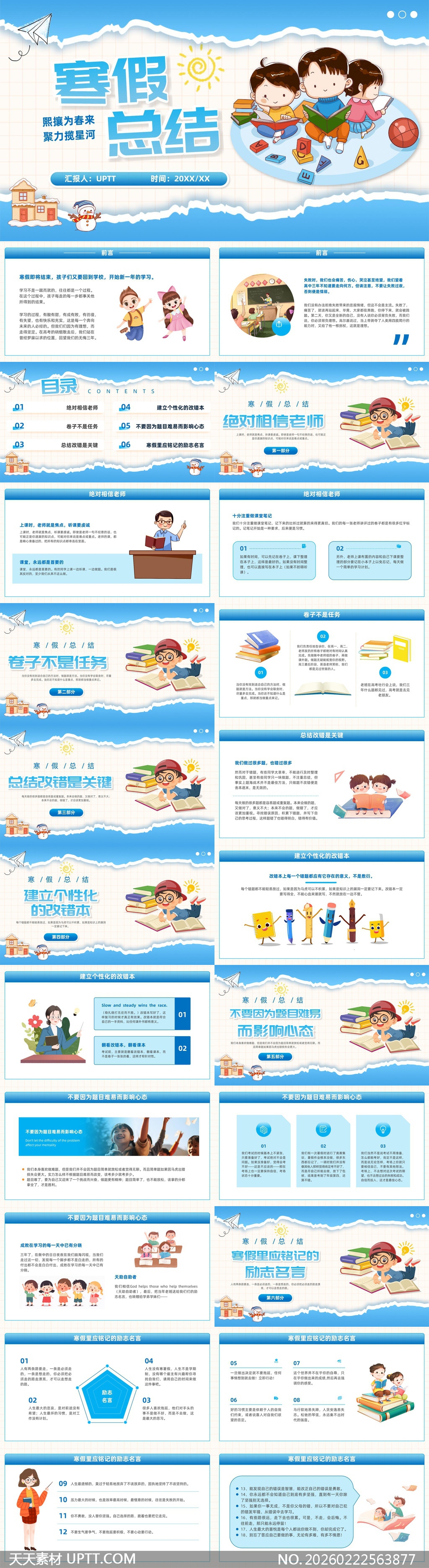 本模板采用清新明快的蓝色手绘插画风格,搭配撕纸边框、纸飞机、雪人等寒假元素,营造轻松活泼又不失严谨的学习氛围;内容结构清晰,涵盖前言、目录、六大核心板块(如“绝对相信老师”“总结改错是关键”“建立个性化的改错本”等),融合童趣角色与实用学习方法论,并巧妙嵌入励志名言与互动式排版;适用于中小学教师寒假学习成果汇报、家长会分享、学生自主复盘展示或班级总结班会,兼顾教育性与视觉亲和力,助力高效传达成长反思与新学期规划。【 素材唯一编号 20260222563877 】,卡通类蓝色风格PPTX格式素材下载,文件格式为.PPTX,下载完成后的文件为一个压缩包,素材压缩包大小37.71 MB,请解压后用相应软件打开。
