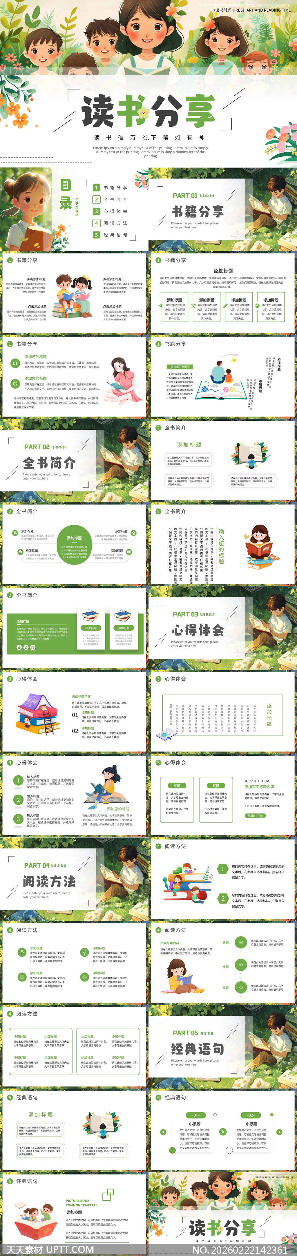 本PPT模板采用清新自然的插画风格,以柔和绿意与童趣人物营造温馨阅读氛围,画面中孩子静坐草地、手捧书本的场景充满感染力;分为书籍分享、全书简介、心得体会、阅读方法及经典语句五大模块,适用于校园读书会、图书馆推广活动、家庭教育讲座及儿童阅读营等场景,兼具美观性与实用性,助力轻松打造富有温度与启发性的儿童阅读主题演示。【 素材唯一编号 20260222142361 】,卡通类绿色风格PPTX格式素材下载,文件格式为.PPTX,下载完成后的文件为一个压缩包,素材压缩包大小26.67 MB,请解压后用相应软件打开。