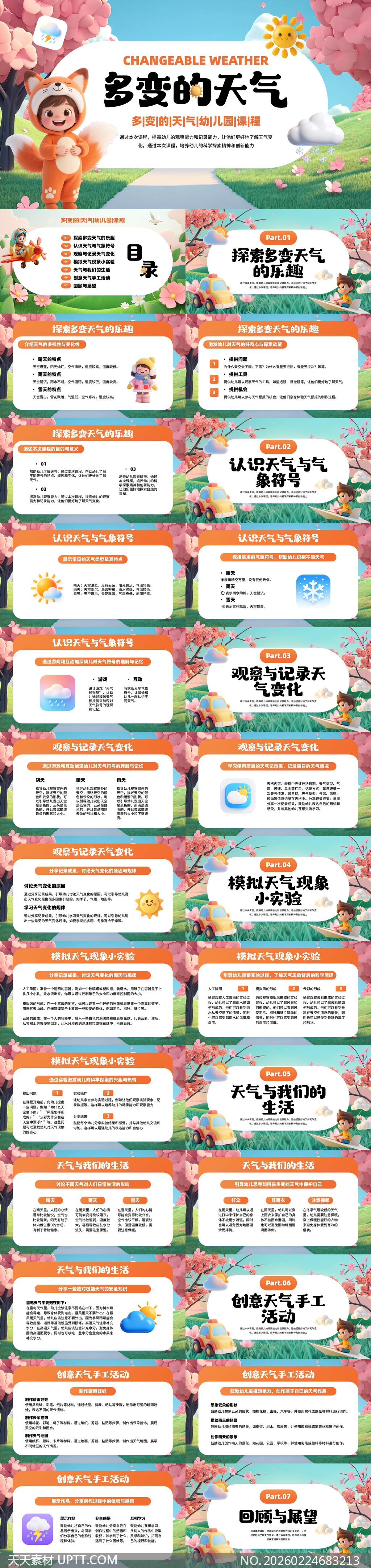 本PPT模板采用清新可爱的卡通插画风格,以粉色樱花、萌趣动物与童趣场景营造温馨活泼的课堂氛围,内容涵盖天气认知、符号识别、变化观察、模拟实验及生活关联等七大模块,融合游戏互动、动手实践与创意表达,支持教师轻松开展探究式教学;适用于幼儿园科学课、主题班会、家园共育活动及幼师培训等场景,兼具教育性与趣味性,助力激发幼儿好奇心与科学思维,提升观察能力、记录习惯与合作意识。【 素材唯一编号 20260224683213 】,卡通类红色风格PPTX格式素材下载,文件格式为.PPTX,下载完成后的文件为一个压缩包,素材压缩包大小25.65 MB,请解压后用相应软件打开。