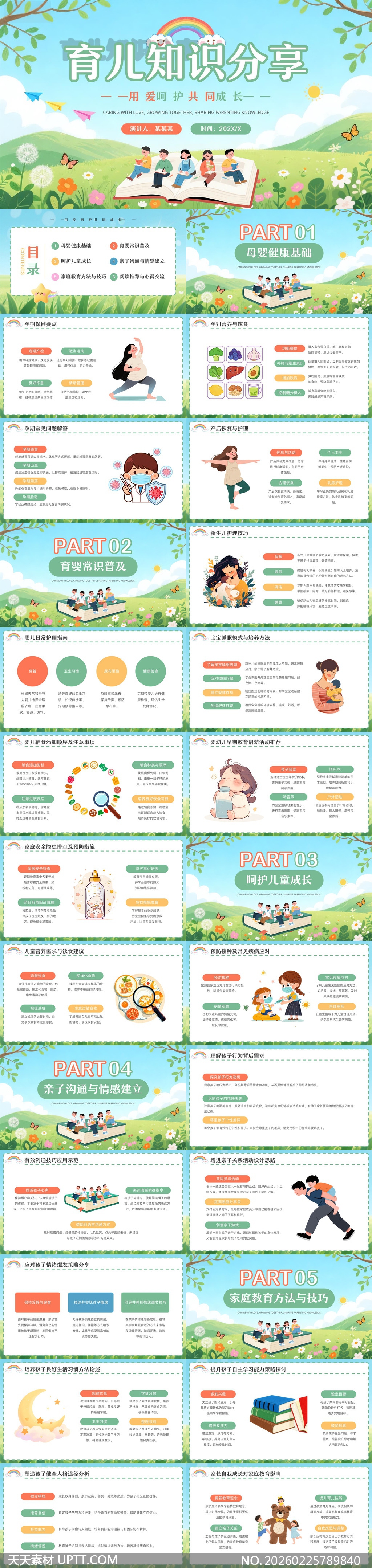 本模板采用清新柔和的手绘插画风格,以绿野、蒲公英、蝴蝶与童趣书本为视觉主线,营造温暖治愈的亲子氛围;内容系统涵盖孕产保健、育儿常识、儿童成长、亲子沟通及家庭教育五大模块,便于讲师生动讲解;适用于社区家长课堂、早教机构培训、医院孕妇学校及线上育儿课程等场景,兼顾专业性与亲和力,助力高效传递科学育儿理念。【 素材唯一编号 20260225789840 】,插画类绿色风格PPTX格式素材下载,文件格式为.PPTX,下载完成后的文件为一个压缩包,素材压缩包大小25.82 MB,请解压后用相应软件打开。