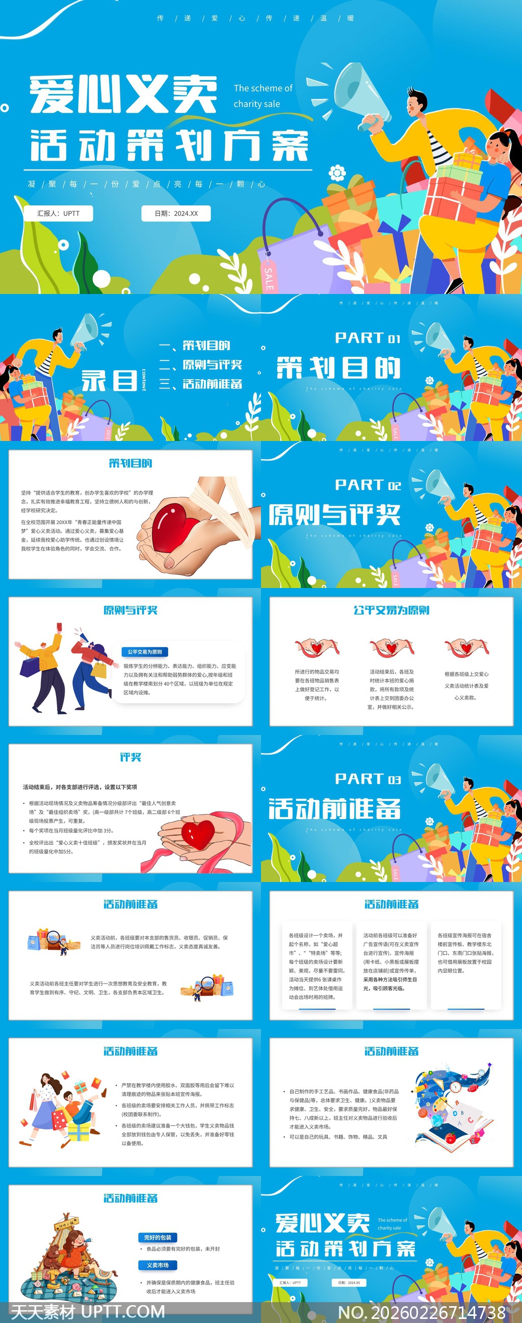 本PPT模板采用清新活力的蓝绿主色调与扁平化插画风格,融合手绘爱心、义卖摊位、学生互动等生动元素,视觉温暖富有感染力;涵盖策划目的、公平交易原则、评奖机制及全流程筹备细节,支持自定义汇报人与日期;适用于高校社团、中小学德育处开展爱心义卖活动前的方案汇报、工作部署或经验分享场景,兼具实用性与传播力,助力高效传达公益理念与组织逻辑。【 素材唯一编号 20260226714738 】,简约类蓝色风格PPTX格式素材下载,文件格式为.PPTX,下载完成后的文件为一个压缩包,素材压缩包大小50.3 MB,请解压后用相应软件打开。