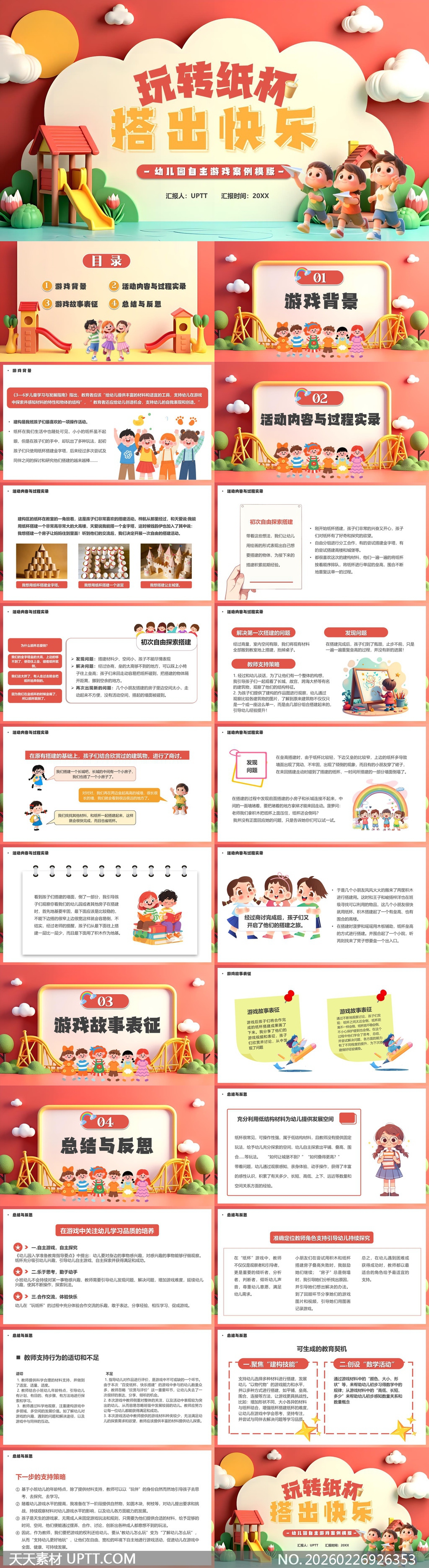 本PPT模板以童趣3D插画风格呈现幼儿园纸杯自主搭建活动全流程,融合游戏背景、实录过程、故事表征与反思总结四大模块,突出幼儿在自由探索中发展建构能力、合作意识与问题解决能力的教育价值;内容紧扣《3–6岁儿童学习与发展指南》,嵌入真实教学场景图例与教师支持策略,适用于园本教研分享、新教师培训、优质课例汇报及家园共育展示,兼具专业性与可视化表达,助力幼教工作者高效呈现游戏化课程实践成果。【 素材唯一编号 20260226926353 】,卡通类红色风格PPTX格式素材下载,文件格式为.PPTX,下载完成后的文件为一个压缩包,素材压缩包大小25.35 MB,请解压后用相应软件打开。