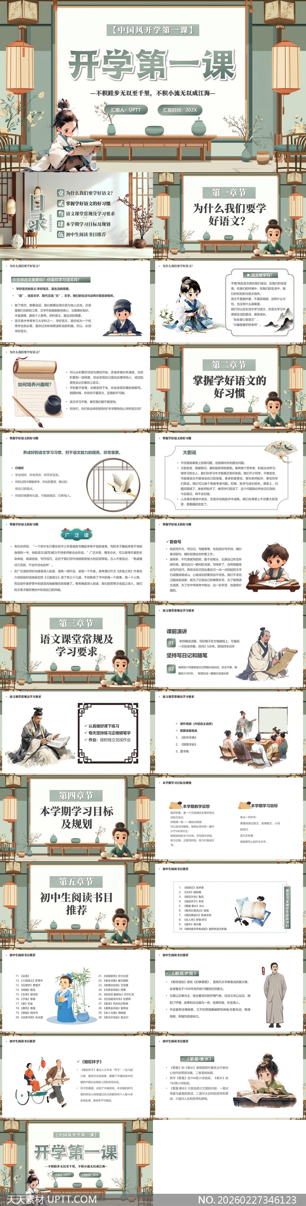 本PPT模板以典雅青绿山水与传统窗棂、灯笼、卷轴等元素营造浓郁中国风意境,搭配古风插画人物与书法字体,视觉清新雅致又不失文化厚重感;涵盖语文学习意义、习惯养成、课堂规范、学期目标及经典书目推荐五大模块,兼顾思想引导与实操指导;适用于中小学开学季语文教师备课、新生入学教育或家长会展示,亦可作为校本课程资源二次编辑使用,助力打造有温度、有深度的传统文化浸润式课堂。【 素材唯一编号 20260227346123 】,中国风类绿色风格PPTX格式素材下载,文件格式为.PPTX,下载完成后的文件为一个压缩包,素材压缩包大小23.68 MB,请解压后用相应软件打开。