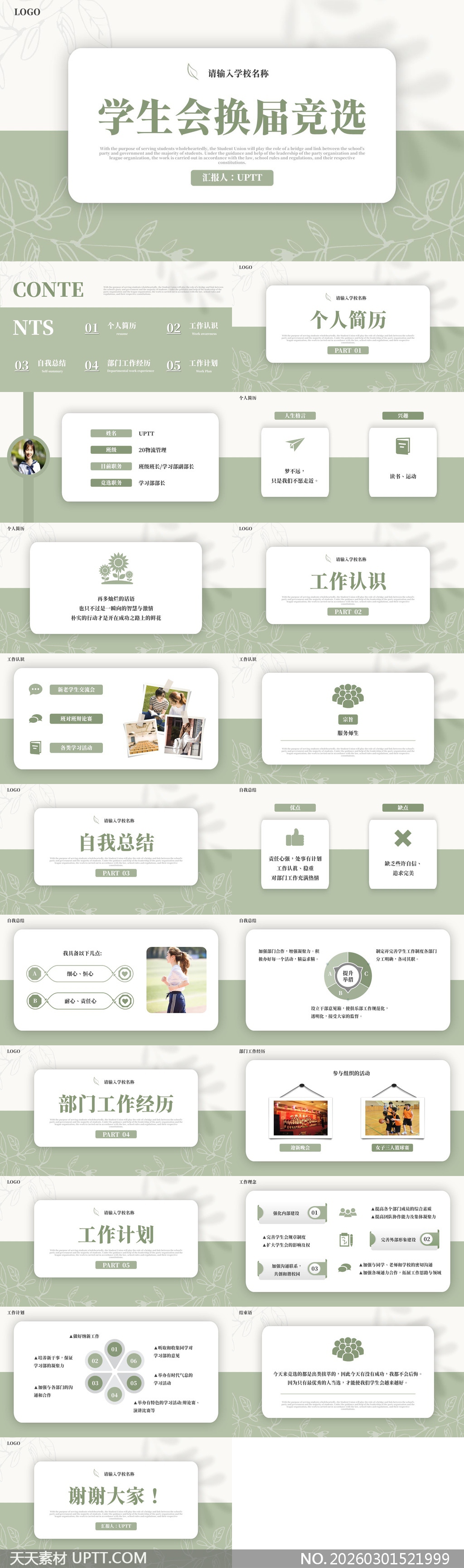本模板采用清新淡雅的莫兰迪绿色系搭配简约线条植物纹样,营造出青春活力又不失稳重的视觉氛围;内容结构清晰完整,涵盖个人简历、工作认知、自我总结、部门经历与未来计划五大核心模块,便于竞选者高效呈现履职成果与工作思路;适用于高校学生会换届竞选、社团干部述职、班级委员汇报等校园场景,兼顾专业性与亲和力,助力演讲者自信表达、赢得认同。【 素材唯一编号 20260301521999 】,简约类绿色风格PPTX格式素材下载,文件格式为.PPTX,下载完成后的文件为一个压缩包,素材压缩包大小59.61 MB,请解压后用相应软件打开。