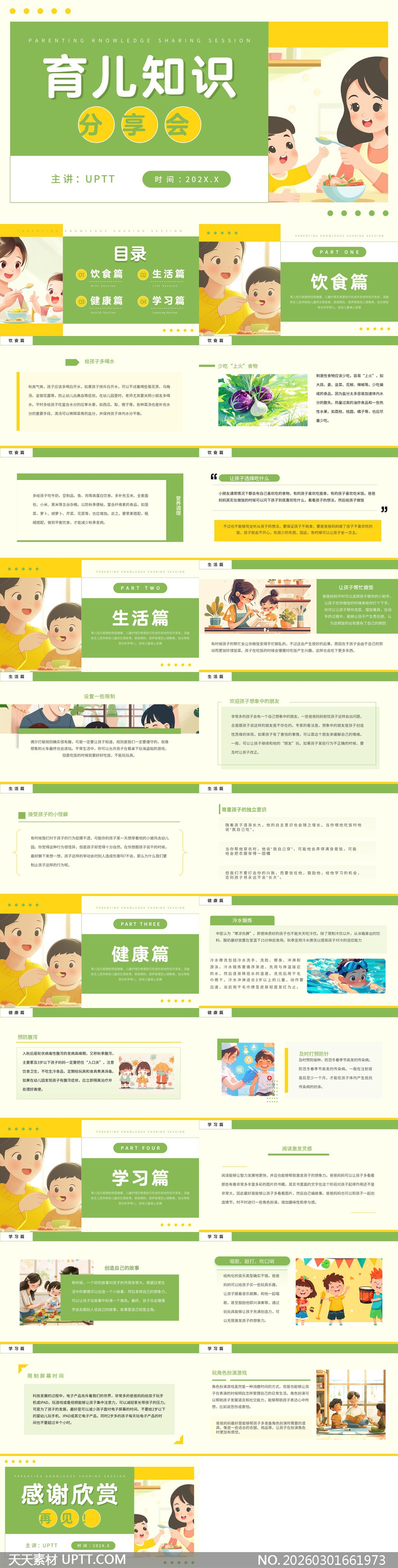 本模板采用清新柔和的绿色主调与温馨手绘插画风格,内容涵盖饮食、生活、健康、学习四大育儿核心模块,每页均融入实用育儿知识与互动建议;适用于社区家长课堂、幼儿园讲座、母婴品牌分享会及线上直播课等场景,既专业又富亲和力,助力教育者高效呈现科学育儿理念,让知识传递更温暖、更易被接受。【 素材唯一编号 20260301661973 】,卡通类绿色风格PPTX格式素材下载,文件格式为.PPTX,下载完成后的文件为一个压缩包,素材压缩包大小20.78 MB,请解压后用相应软件打开。