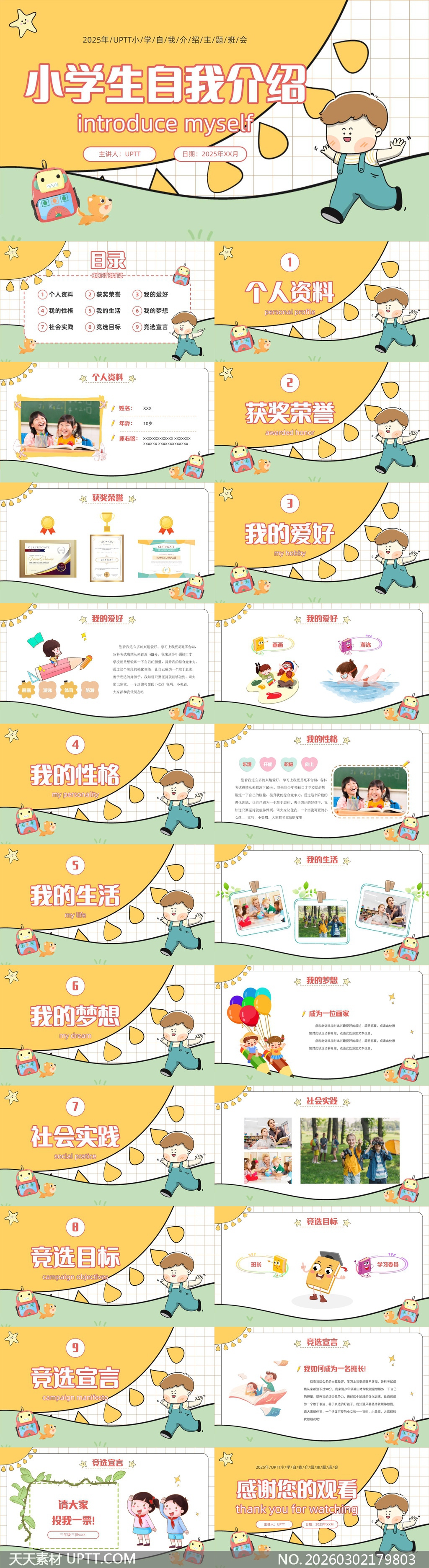 本模板采用清新活泼的可爱插画风格,以九宫格逻辑清晰呈现小学生自我介绍的九大核心模块——从个人资料、获奖荣誉到爱好、性格、生活、梦想、社会实践及竞选目标与宣言,搭配手绘小人、书包、气球等童趣元素与柔和暖色调,营造轻松亲切的表达氛围;适用于开学班会、少先队竞选、校园展示或家长开放日等场景,帮助孩子自信条理地展现成长点滴与个性风采,兼具教育性与趣味性,是教师指导与学生自主制作的理想素材。【 素材唯一编号 20260302179803 】,卡通类黄色风格PPTX格式素材下载,文件格式为.PPTX,下载完成后的文件为一个压缩包,素材压缩包大小43.02 MB,请解压后用相应软件打开。