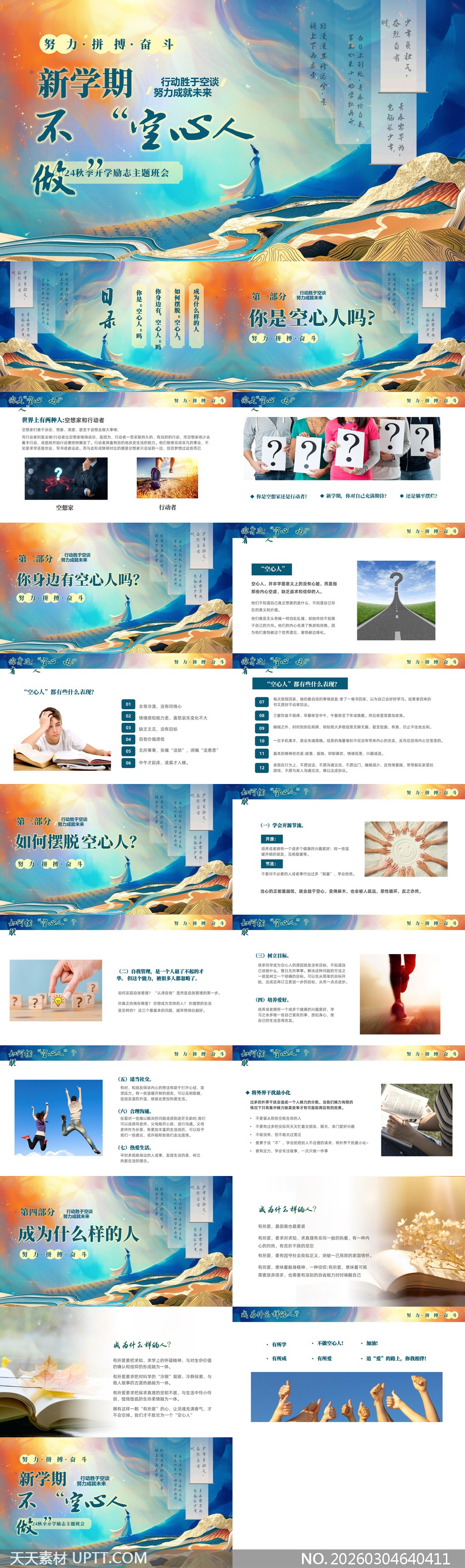 本PPT模板以诗意山水插画与现代视觉语言融合,采用蓝金渐变主色调营造沉静而奋进的氛围,结构清晰分为现象剖析、成因识别、行动策略与价值引领四大部分,内含“空心人”特征清单、自我诊断问卷、可落地的7步成长法及互动讨论环节设计;适用于高校/中学新学期主题班会、思政教育、心理辅导及学生干部培训场景,兼具思想深度与实操性,助力教师高效开展价值观引导与行动力激发工作。【 素材唯一编号 20260304640411 】,中国风类蓝色风格PPTX格式素材下载,文件格式为.PPTX,下载完成后的文件为一个压缩包,素材压缩包大小27.71 MB,请解压后用相应软件打开。