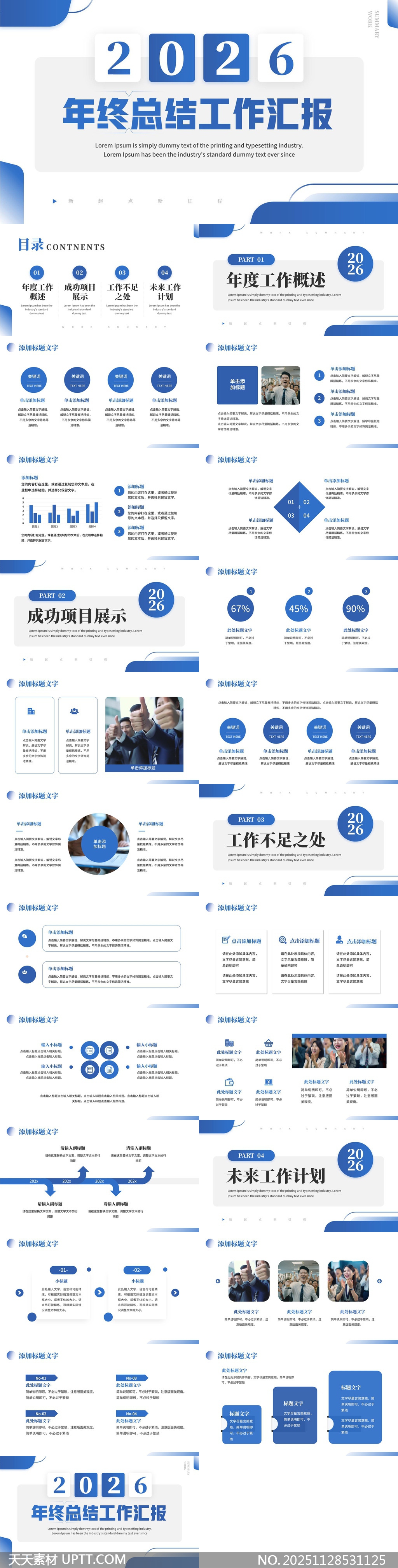 本模板融合现代感线条与数据可视化元素,适用于企业、团队及个人在2026年度总结汇报中展示工作成果与未来规划。结构清晰涵盖年度概述、项目展示、不足分析及计划展望四大模块,搭配图表、图标与人物插图增强表现力,适合职场汇报、年终述职、项目复盘等正式场景,提升演示专业度与视觉吸引力。【 素材唯一编号 20251128531125 】,简约类蓝色风格PPTX格式素材下载,文件格式为.PPTX,下载完成后的文件为一个压缩包,素材压缩包大小18.47 MB,请解压后用相应软件打开。