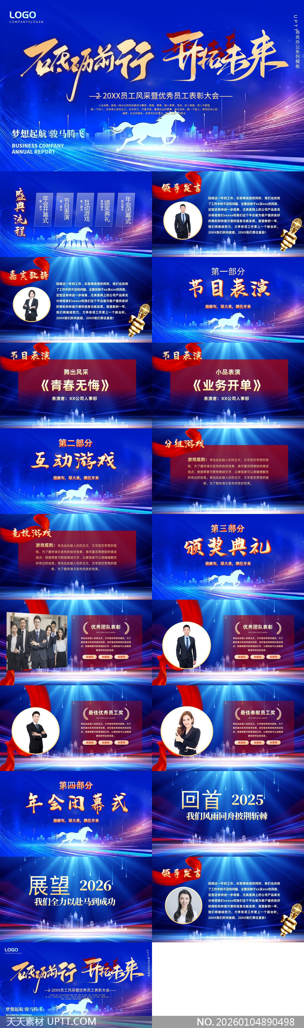这款PPT模板以深邃蓝与科技光效为主视觉,专为年度表彰大会设计,涵盖领导致辞、节目表演、互动游戏、颁奖典礼及闭幕展望等完整流程,适配企业年会、团队激励、业绩总结等多种正式场合,助力呈现专业、震撼且富有凝聚力的汇报现场。【 素材唯一编号 20260104890498 】,渐变类蓝色风格PPTX格式素材下载,文件格式为.PPTX,下载完成后的文件为一个压缩包,素材压缩包大小5.61 MB,请解压后用相应软件打开。