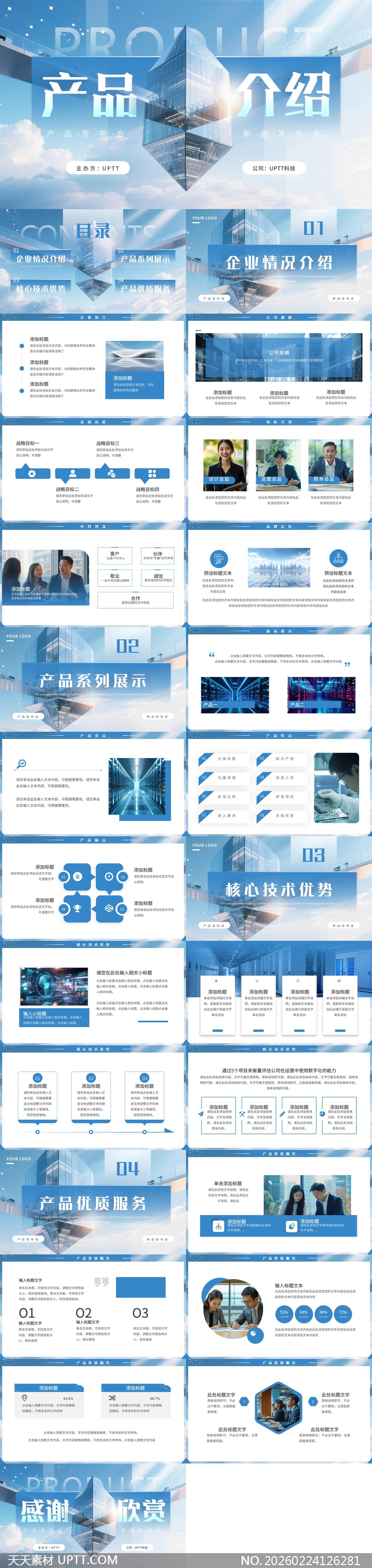 本模板采用科技蓝渐变主色调搭配立体几何图形与通透玻璃质感元素,营造出专业、前沿的视觉氛围;内含企业概况、产品系列、核心技术及优质服务四大核心模块,适配高科技企业新品发布、融资路演、年度战略汇报等正式商务场景,提升制作效率与专业度。【 素材唯一编号 20260224126281 】,简约类蓝色风格PPTX格式素材下载,文件格式为.PPTX,下载完成后的文件为一个压缩包,素材压缩包大小29.27 MB,请解压后用相应软件打开。