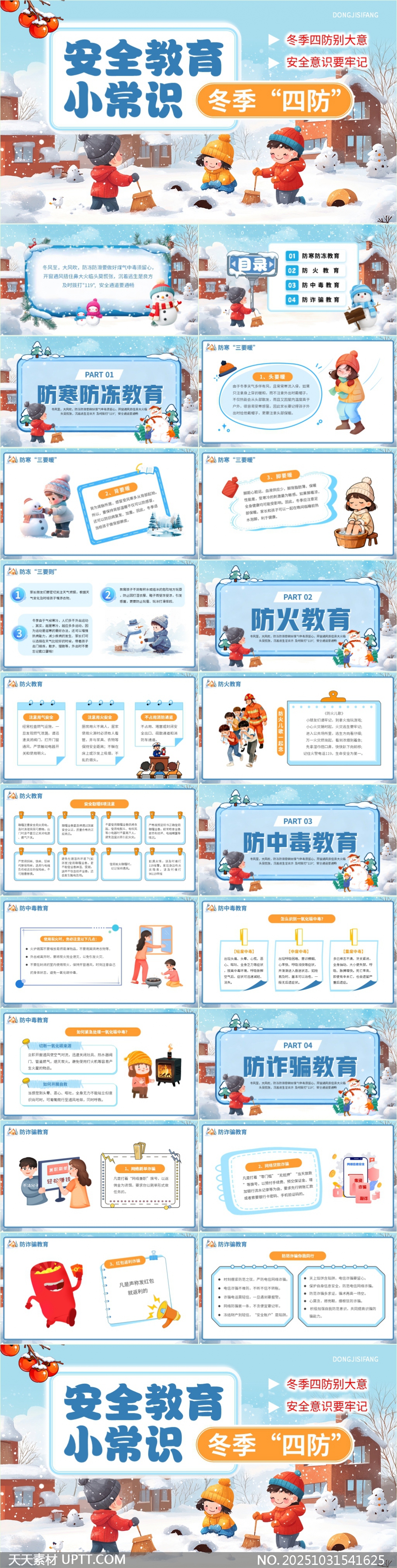 本PPT模板以温馨可爱的冬季卡通风格呈现,涵盖防寒保暖、防火安全、防中毒及防诈骗四大主题,内容详实、图文并茂,适合学校、社区、企事业单位开展冬季安全教育宣传。设计清新活泼,配色温暖舒适,兼具实用性与视觉吸引力,可直接用于课堂讲解、家长会或安全培训场景,助力提升公众冬季安全防范意识。【 素材唯一编号 20251031541625 】,卡通类彩色风格PPTX格式素材下载,文件格式为.PPTX,下载完成后的文件为一个压缩包,素材压缩包大小35.94 MB,请解压后用相应软件打开。