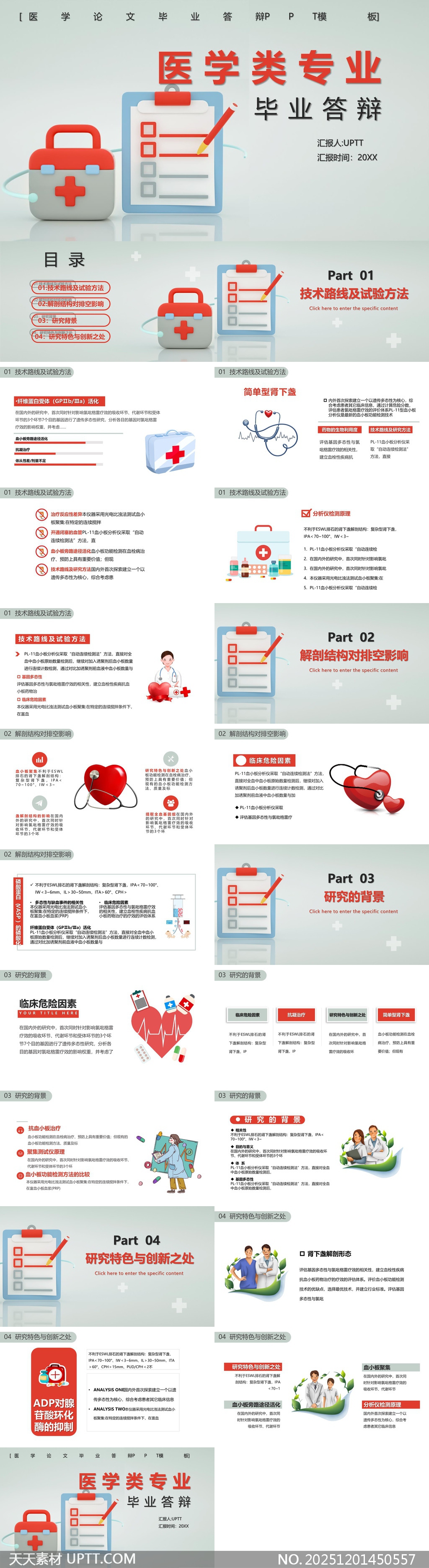 本PPT模板专为医学类专业毕业答辩设计,融合医疗元素与简洁排版,采用红白蓝主色调搭配急救箱、听诊器等图标,突出专业氛围。内容结构清晰,涵盖技术路线、研究背景、创新点等核心模块,适用于临床、基础医学、护理等方向的学术汇报,助力学生高效呈现研究成果,提升答辩表现力与视觉专业度。【 素材唯一编号 20251201450557 】,简约类红色风格PPTX格式素材下载,文件格式为.PPTX,下载完成后的文件为一个压缩包,素材压缩包大小4.75 MB,请解压后用相应软件打开。
