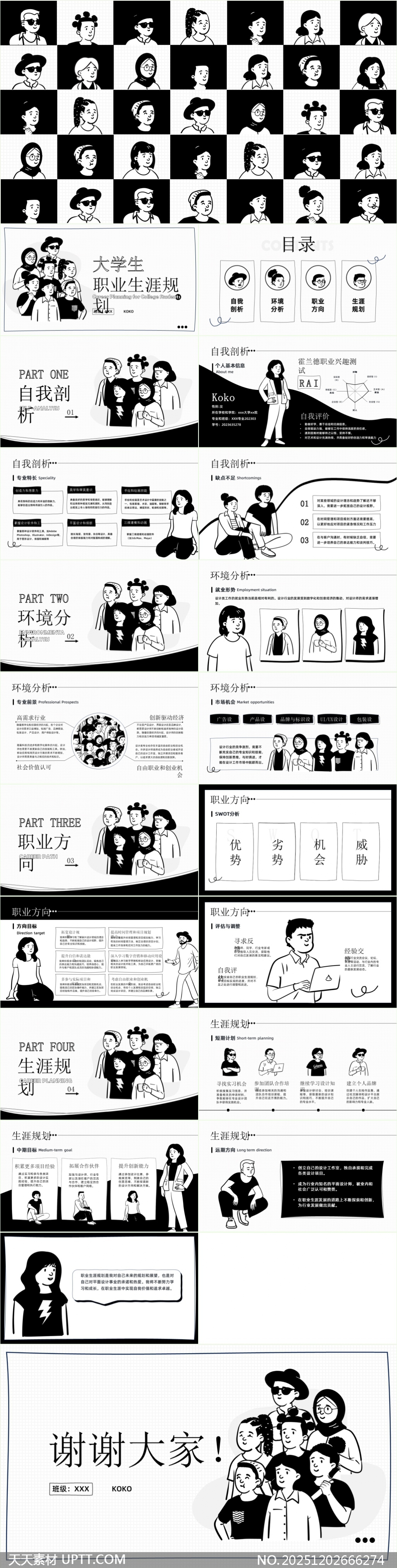 职业 规划 手绘 大学生规划 职业生涯PPT 黑白手绘 高校就业 自我剖析 职业方向分析