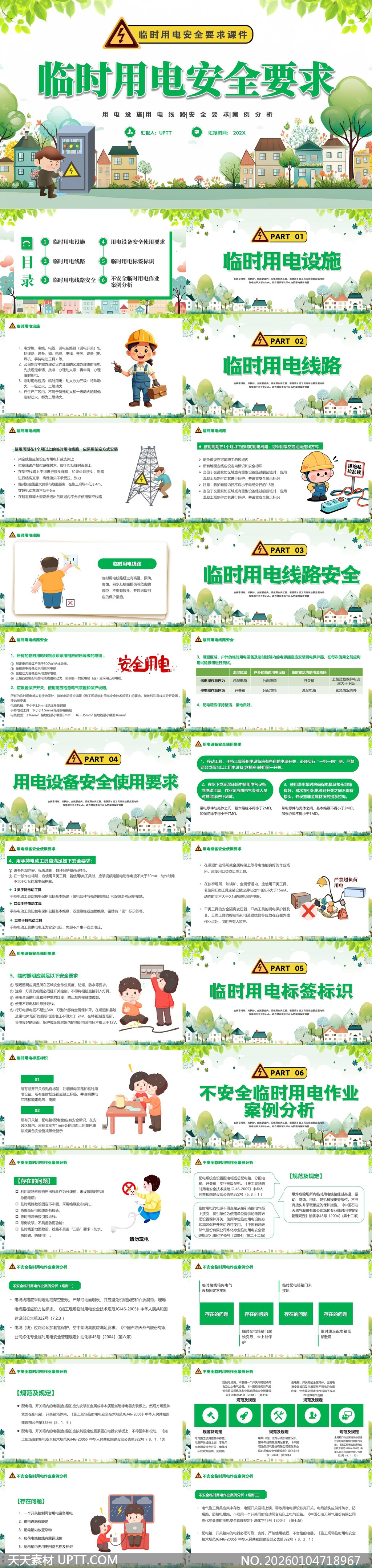 这款卡通风格PPT模板以清新绿意与萌趣插画重构安全培训场景,通过分模块结构清晰呈现临时用电设施、线路、设备使用及标签标识等核心规范,搭配生动角色与实景图示降低理解门槛,适用于企业新员工安全教育、工地班组晨会或校园安全知识普及,让枯燥条例变得直观易记,提升培训参与度与知识吸收效率。【 素材唯一编号 20260104718967 】,插画类绿色风格PPTX格式素材下载,文件格式为.PPTX,下载完成后的文件为一个压缩包,素材压缩包大小15.44 MB,请解压后用相应软件打开。
