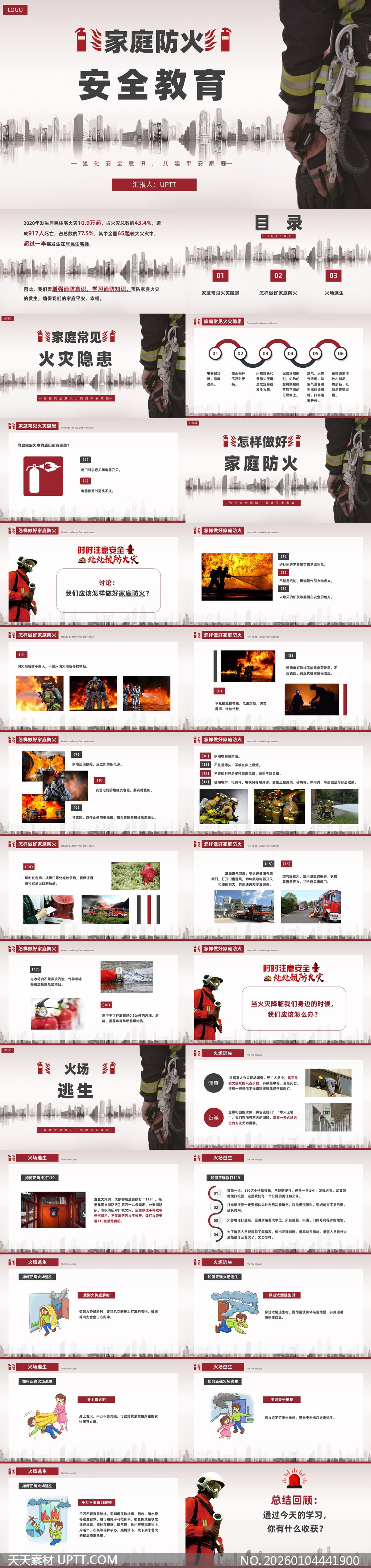 本PPT模板以醒目红灰配色与真实消防场景图打造专业视觉,内容涵盖家庭隐患排查、防火措施、火场逃生等实用模块,图文并茂、步骤清晰,适配社区讲座、学校安全课及企业员工培训,帮助受众快速掌握自救互救技能,提升全民防火意识,是开展安全教育的高效可视化工具。【 素材唯一编号 20260104441900 】,政务类红色风格PPTX格式素材下载,文件格式为.PPTX,下载完成后的文件为一个压缩包,素材压缩包大小86.27 MB,请解压后用相应软件打开。