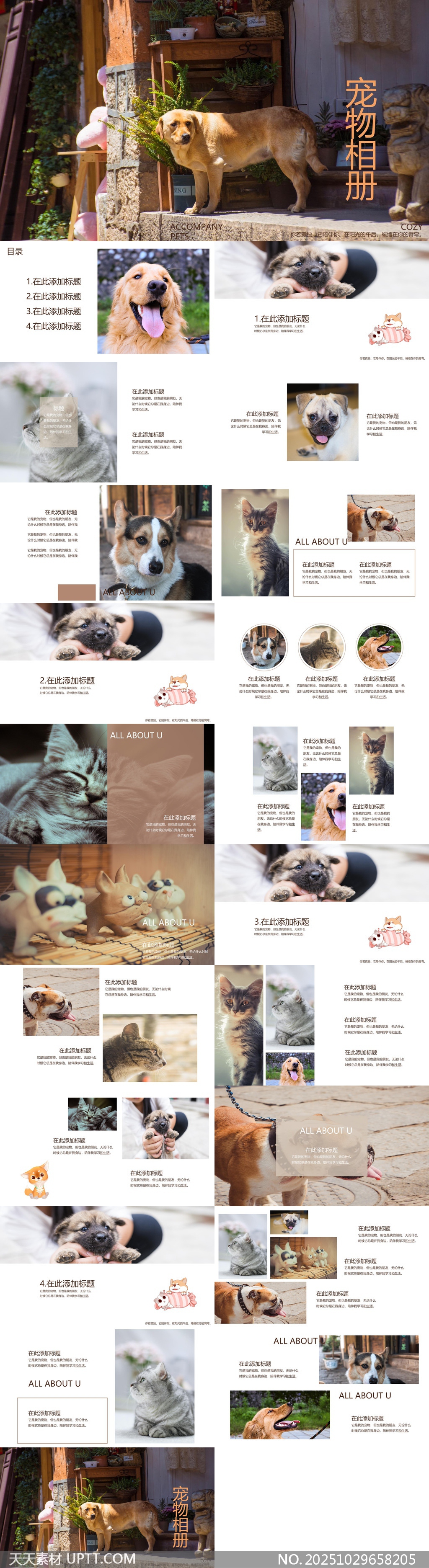 该PPT模板以温馨治愈的宠物生活为主题,精选多张高清萌宠实拍图,搭配柔和色调与简约排版,营造出温暖自然的视觉氛围,适用于宠物成长记录、领养宣传、宠物店推广或家庭纪念相册等多种场景,轻松呈现宠物日常的点滴温情,让每一页都充满爱与陪伴的感动。【 素材唯一编号 20251029658205 】,企业宣传类彩色风格PPTX格式素材下载,文件格式为.PPTX,下载完成后的文件为一个压缩包,素材压缩包大小102.19 MB,请解压后用相应软件打开。