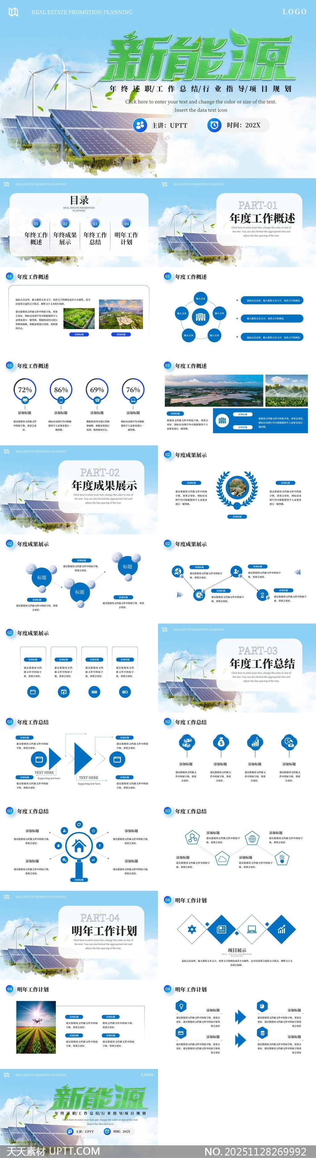本PPT模板以清新蓝绿为主色调,融合太阳能板、风力发电等新能源元素,视觉呈现科技感与生态美感兼具的现代风格,适用于新能源企业年度工作总结、项目汇报及行业规划展示。【 素材唯一编号 20251128269992 】,企业宣传类蓝色风格PPTX格式素材下载,文件格式为.PPTX,下载完成后的文件为一个压缩包,素材压缩包大小2.85 MB,请解压后用相应软件打开。