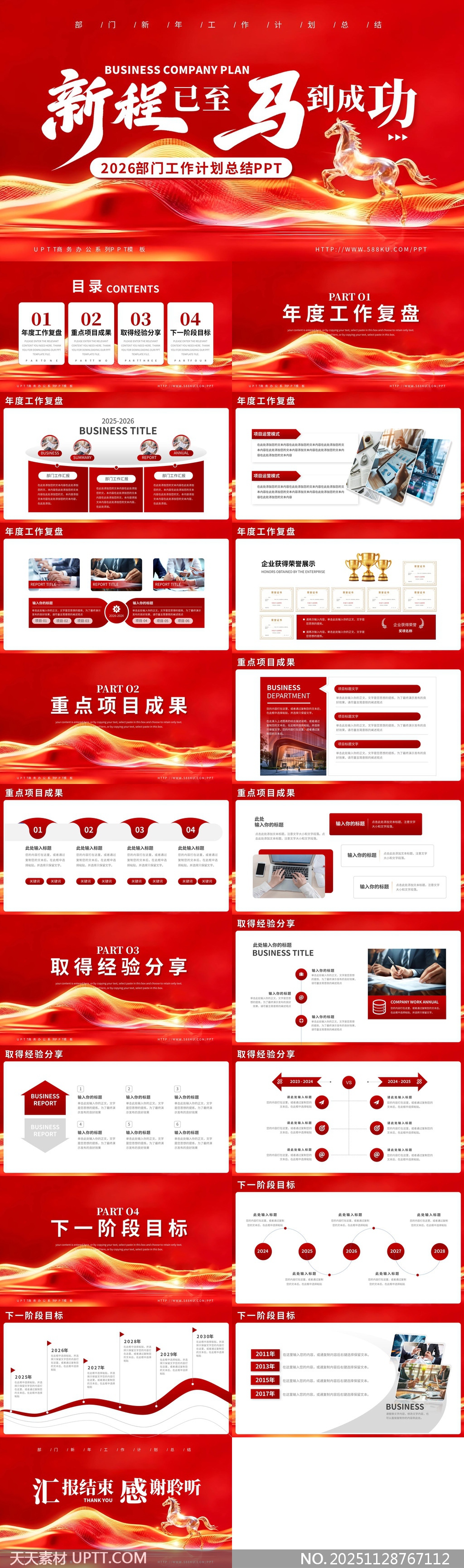 本PPT模板以红色为主色调,融合奔腾骏马元素,象征奋勇向前、锐意进取的精神风貌,整体设计大气磅礴,富有视觉冲击力,适用于企业年度工作总结、部门工作汇报及年度计划展示等正式场合。模板结构清晰,包含工作复盘、项目成果、经验分享与未来目标四大模块,搭配动态线条与现代排版,提升内容呈现的专业性与感染力,助力高效传达核心信息。【 素材唯一编号 20251128767112 】,工作总结类红色风格PPTX格式素材下载,文件格式为.PPTX,下载完成后的文件为一个压缩包,素材压缩包大小2.73 MB,请解压后用相应软件打开。