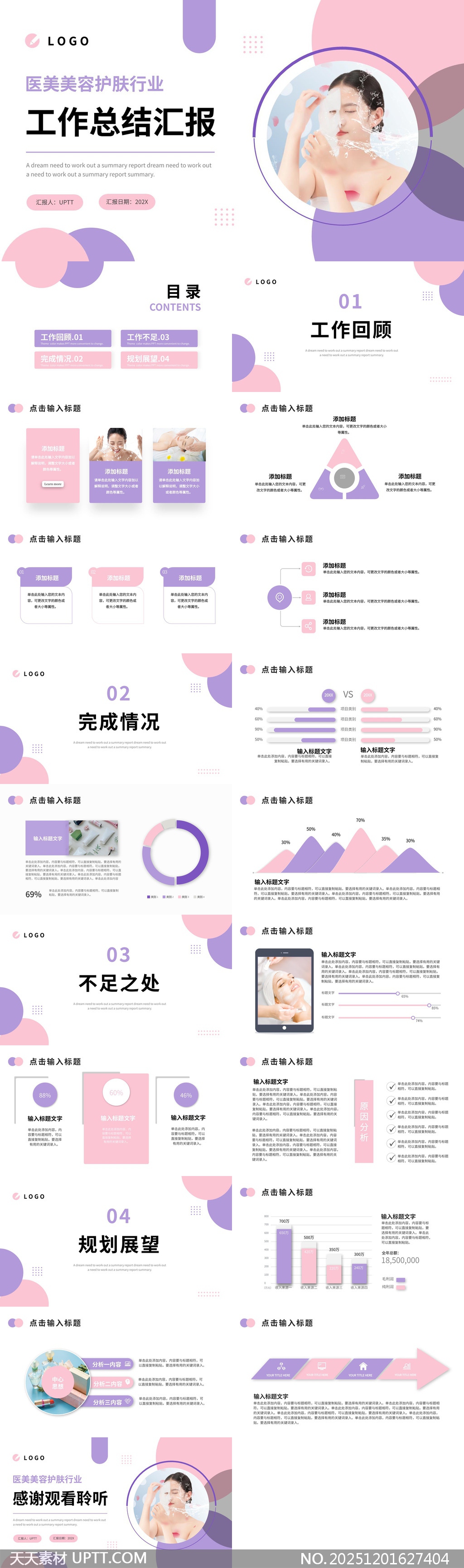 本模板专为医美护肤行业量身打造,采用柔和粉紫渐变色调与简约几何元素,契合行业美学调性。页面布局清晰,包含工作回顾、成果展示、问题分析及未来规划等模块,搭配图表、数据可视化与高清素材,助力高效呈现年度总结与战略汇报。适用于美容机构、医美团队、护肤品牌等场景的内部复盘或对外展示,提升汇报的专业度与吸引力。【 素材唯一编号 20251201627404 】,素材下载,文件格式为.PPTX,下载完成后的文件为一个压缩包,素材压缩包大小4.76 MB,请解压后用相应软件打开。