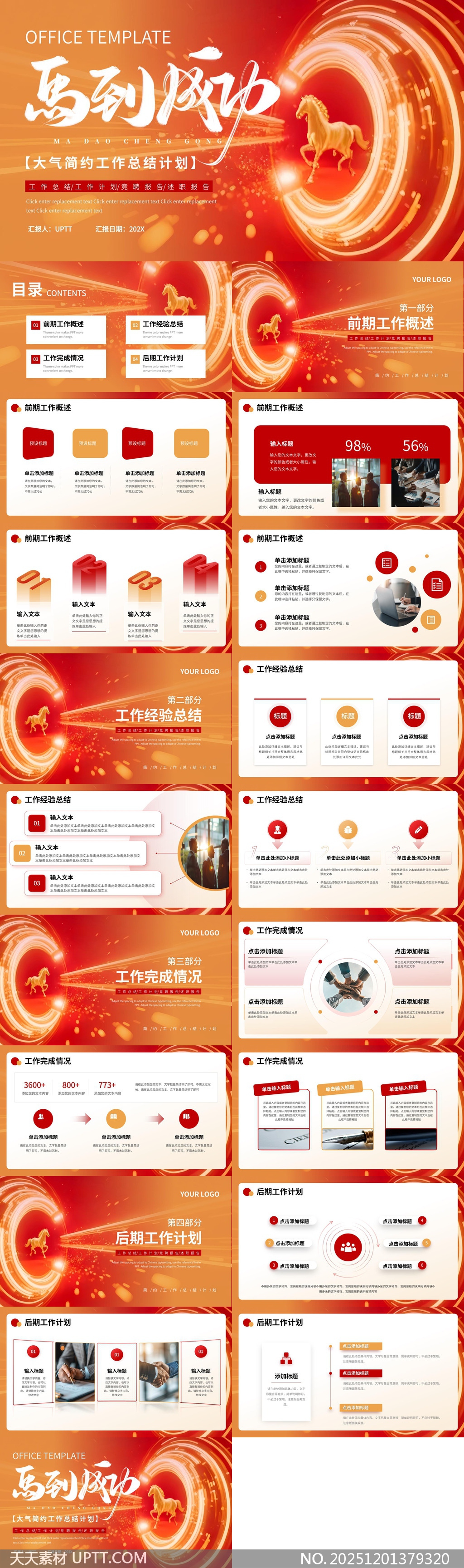 该PPT模板以“马到成功”为主题,采用大气磅礴的红色渐变背景与金色骏马元素,融合现代简约设计风格,视觉冲击力强,彰显积极向上的工作态度。整体布局清晰,结构分明,涵盖工作概述、经验总结、完成情况及后续计划四大模块,适用于年度总结、述职报告、项目汇报等正式场合,助力用户高效呈现专业内容,提升演示质感与表达效果。【 素材唯一编号 20251201379320 】,工作总结类红色风格PPTX格式素材下载,文件格式为.PPTX,下载完成后的文件为一个压缩包,素材压缩包大小6.68 MB,请解压后用相应软件打开。