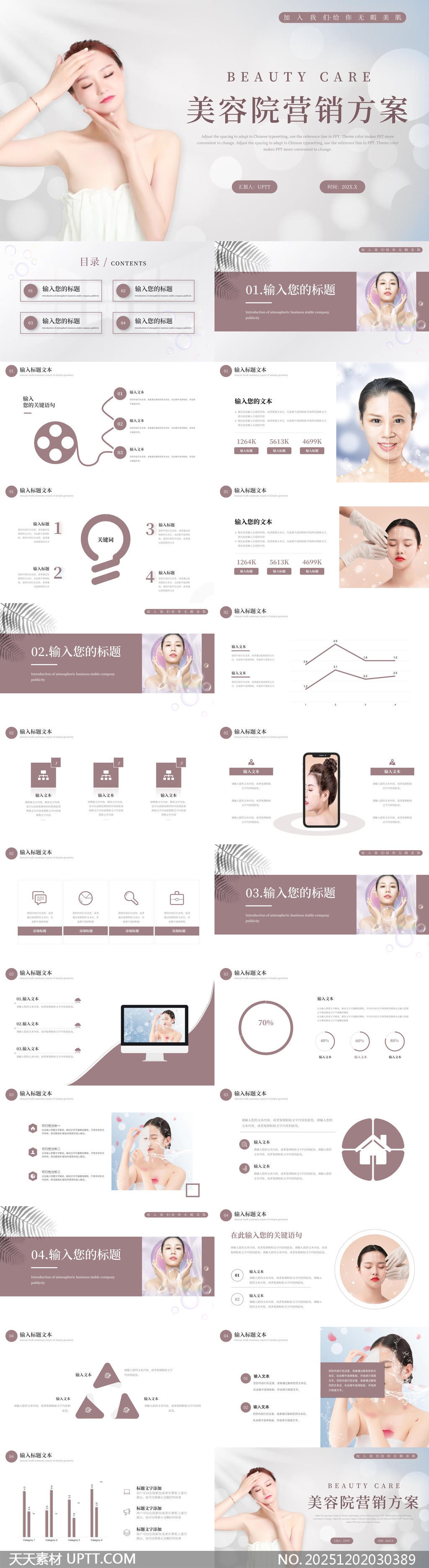 该美容院营销方案PPT模板设计优雅精致,以柔和色调与高清人物素材营造专业高端氛围,搭配简洁排版与数据图表,突出品牌调性与服务亮点,适用于美容机构宣传、项目推介及客户沟通场景,助力提升品牌形象与转化效果。【 素材唯一编号 20251202030389 】,营销活动类彩色风格PPTX格式素材下载,文件格式为.PPTX,下载完成后的文件为一个压缩包,素材压缩包大小2.59 MB,请解压后用相应软件打开。