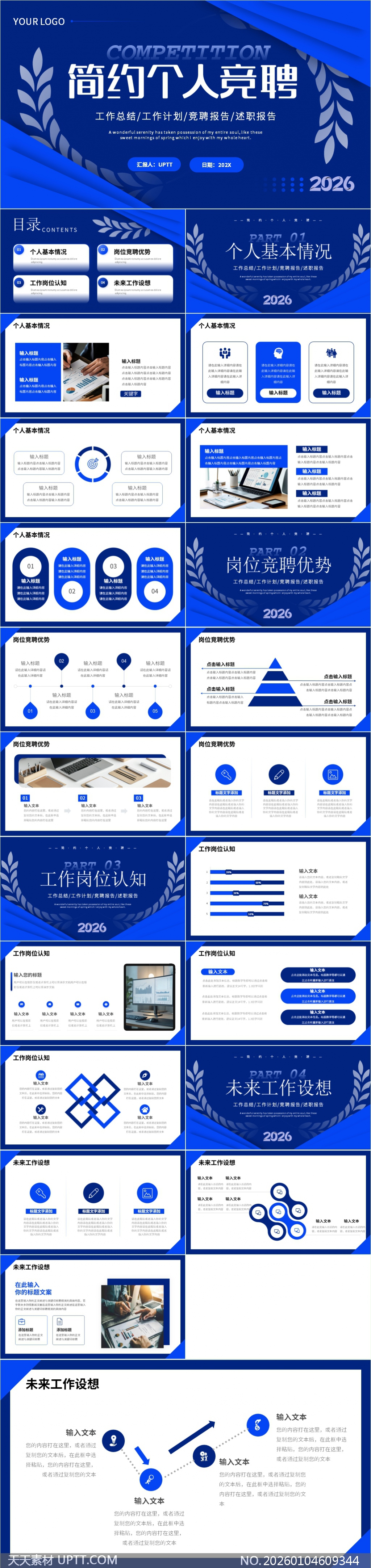 这款商务风PPT模板以深邃蓝色为主调,搭配几何线条与简约图标,营造专业沉稳的视觉氛围,内含个人履历、竞聘优势、岗位认知及未来规划等完整模块,适配述职答辩、晋升汇报、项目提案等多种职场场景,结构清晰、图文并茂,助您高效呈现核心竞争力,提升演讲说服力与品牌形象。【 素材唯一编号 20260104609344 】,招聘竞聘类蓝色风格PPTX格式素材下载,文件格式为.PPTX,下载完成后的文件为一个压缩包,素材压缩包大小6.64 MB,请解压后用相应软件打开。