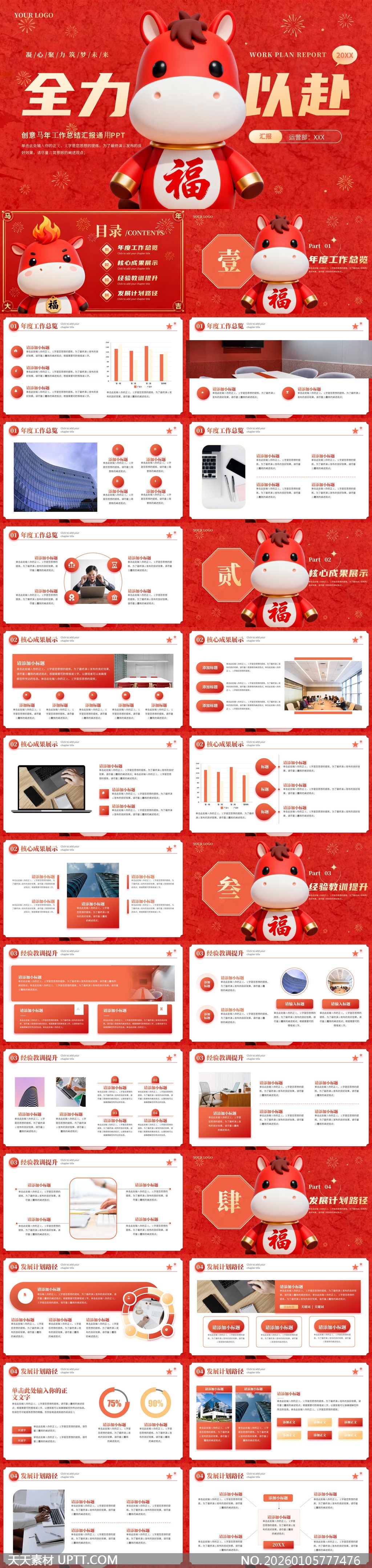 这款PPT模板以浓郁中国红为基调,搭配萌趣马年吉祥物与“福”字元素,营造喜庆热烈的视觉氛围,内含年度总览、成果展示、经验复盘与发展规划等完整模块,适用于企业年终汇报、部门总结或新年动员大会,助您在节日氛围中专业呈现工作亮点,提升汇报感染力与团队凝聚力。【 素材唯一编号 20260105777476 】,工作总结类红色风格PPTX格式素材下载,文件格式为.PPTX,下载完成后的文件为一个压缩包,素材压缩包大小41.01 MB,请解压后用相应软件打开。