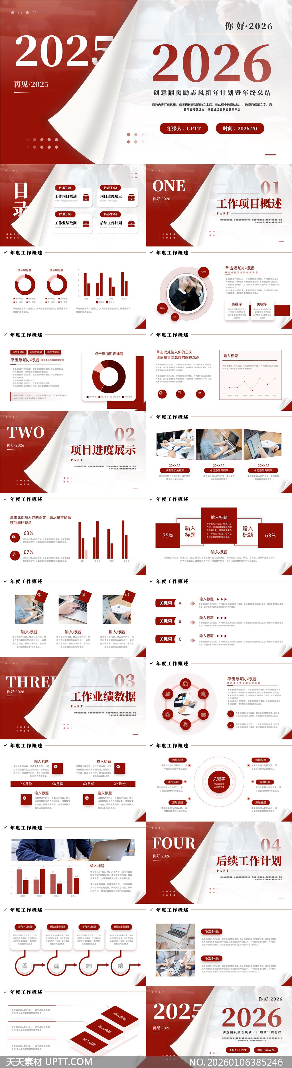 这款PPT模板以红白撞色与立体翻页动效打造视觉冲击力,融合数据图表、项目进度、业绩分析与未来规划四大模块,适配年终述职、新年启动会及团队激励场景,内置可编辑图文框与商务图标,助你高效梳理成果、锚定目标,用创意设计传递专业力量与奋进精神,让汇报不止于陈述,更成为鼓舞士气的视觉盛宴。【 素材唯一编号 20260106385246 】,工作总结类红色风格PPTX格式素材下载,文件格式为.PPTX,下载完成后的文件为一个压缩包,素材压缩包大小5.22 MB,请解压后用相应软件打开。