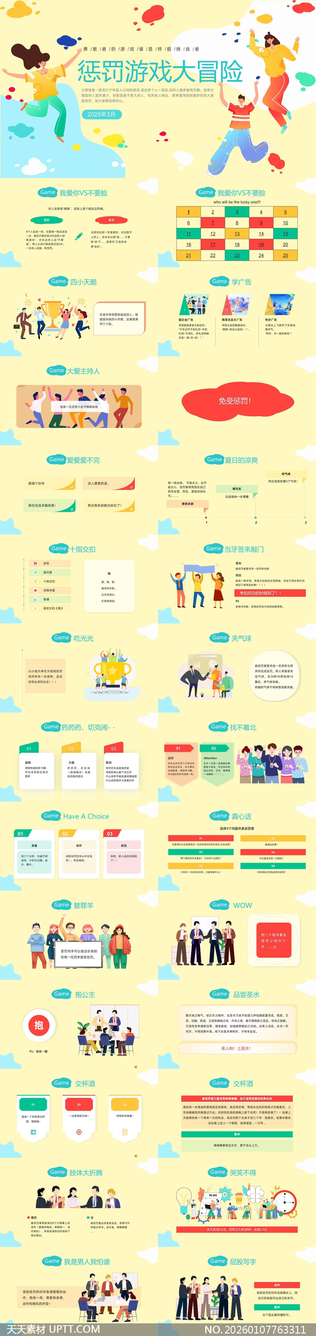 这款PPT模板以明亮活泼的插画风格呈现20+款趣味惩罚游戏,涵盖“我爱你VS不要脸”“四小天鹅”“真心话”等经典互动环节,适配团建破冰、年会暖场、班级聚会等场景,帮助组织者轻松策划高参与度的欢乐活动,让惩罚变惊喜,气氛瞬间升温,是打造难忘集体记忆的实用创意工具。【 素材唯一编号 20260107763311 】,营销活动类黄色风格PPTX格式素材下载,文件格式为.PPTX,下载完成后的文件为一个压缩包,素材压缩包大小7.38 MB,请解压后用相应软件打开。