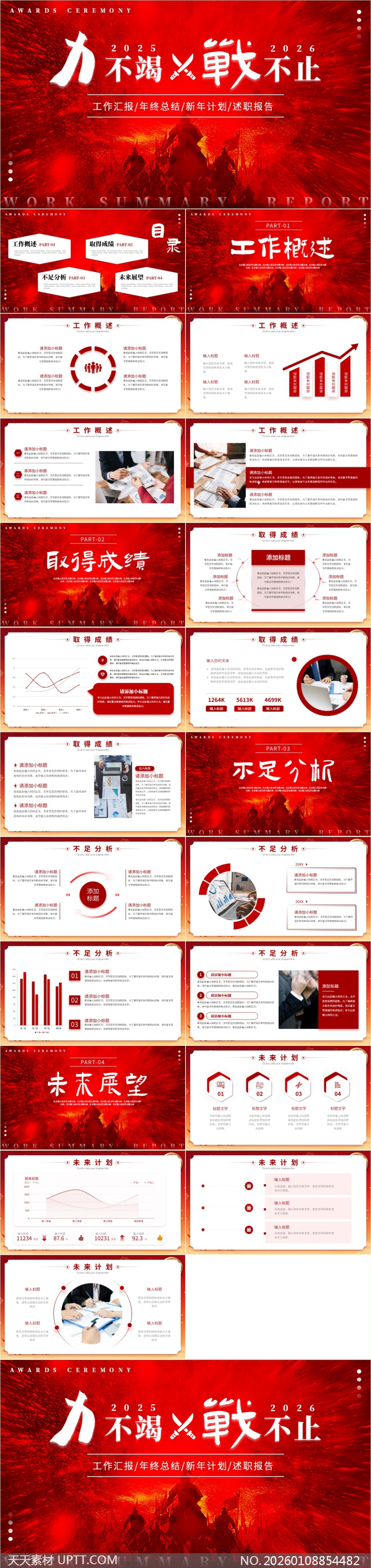这款PPT模板以“力不竭战不止”为精神内核,采用热血红金主色调与动态纹理背景,视觉冲击力强,专为2025-2026年度工作汇报、年终总结、新年规划及述职场景打造;内含工作概述、成绩展示、不足分析、未来展望四大模块,搭配图表、数据框、流程图等专业元素,结构清晰逻辑严谨,助力职场人士高效呈现成果、复盘得失、规划蓝图,适用于企业汇报、团队述职、项目总结等正式场合,彰显拼搏精神与专业态度。【 素材唯一编号 20260108854482 】,述职汇报类红色风格PPTX格式素材下载,文件格式为.PPTX,下载完成后的文件为一个压缩包,素材压缩包大小9.42 MB,请解压后用相应软件打开。