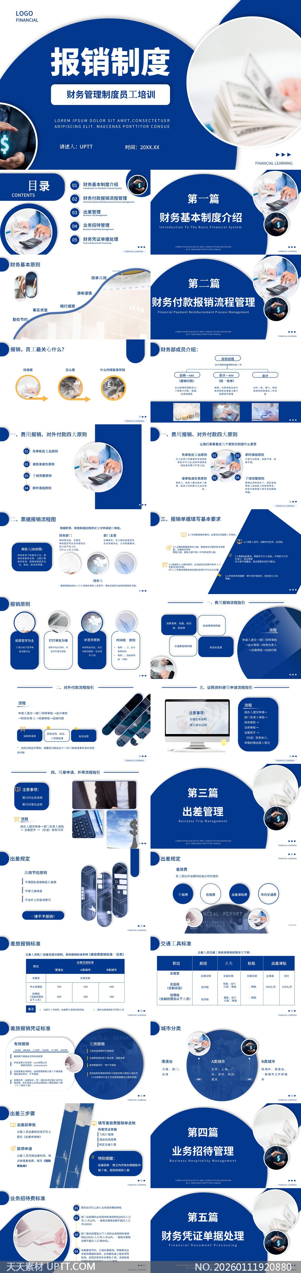 本PPT模板以专业蓝白配色与清晰信息图呈现,系统梳理财务报销全流程、出差管理、业务招待及凭证处理等核心模块,内置流程图、表格与图标化设计,助力HR或财务部门高效开展新员工制度培训,适用于企业内训、合规宣讲及制度落地场景,提升员工理解效率与执行规范性。【 素材唯一编号 20260111920880 】,企业培训类蓝色风格PPTX格式素材下载,文件格式为.PPTX,下载完成后的文件为一个压缩包,素材压缩包大小53.25 MB,请解压后用相应软件打开。
