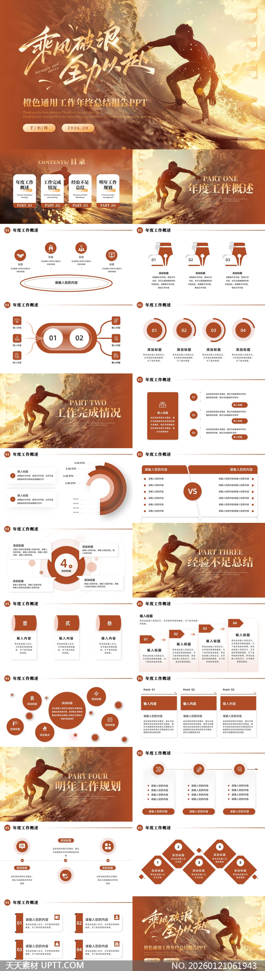 这款PPT模板以“乘风破浪”为视觉内核,采用高饱和橙色系搭配动感冲浪画面,营造积极进取、充满力量的商务氛围;内置年度概述、成果展示、经验复盘与未来规划四大模块,适配企业年终汇报、部门述职及项目总结等正式场合,助您高效呈现业绩、凝聚团队士气,让每一次汇报都成为乘风而上的精彩亮相。【 素材唯一编号 20260121061943 】,工作总结类橙色风格PPTX格式素材下载,文件格式为.PPTX,下载完成后的文件为一个压缩包,素材压缩包大小5.43 MB,请解压后用相应软件打开。