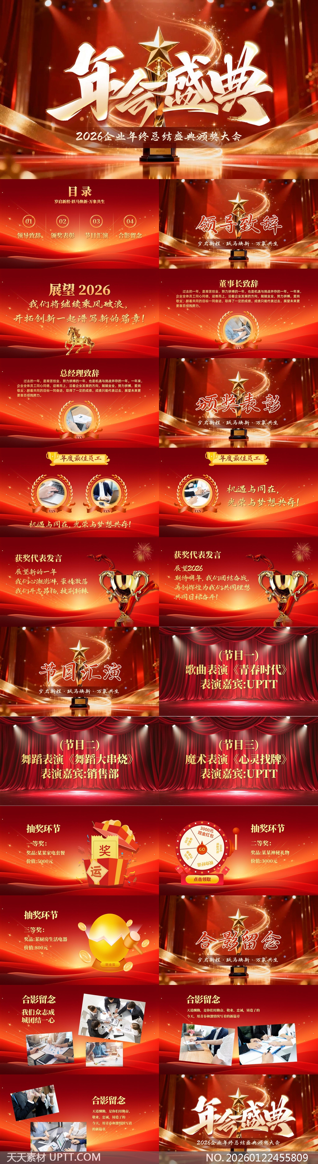 这款PPT模板以热烈喜庆的红金主色调搭配璀璨星光与立体奖杯元素,营造出隆重辉煌的盛典氛围,专为2026企业年终总结与颁奖大会打造,内含领导致辞、表彰环节、节目汇演、抽奖互动及合影留念等完整流程页面,适用于各类公司年会、表彰大会及庆典活动,助您高效呈现精彩时刻,提升现场仪式感与品牌格调。【 素材唯一编号 20260122455809 】,述职汇报类红色风格PPTX格式素材下载,文件格式为.PPTX,下载完成后的文件为一个压缩包,素材压缩包大小24.35 MB,请解压后用相应软件打开。