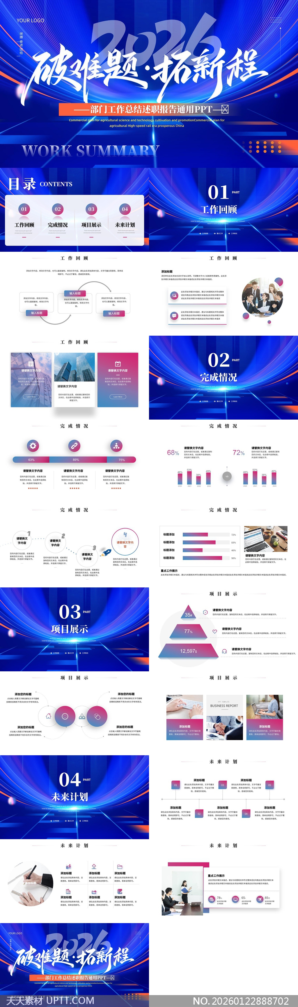 本PPT模板以深蓝科技感视觉贯穿全篇,融合动感光效与现代几何元素,打造专业大气的汇报氛围;内含工作回顾、完成情况、项目展示、未来计划四大模块,适配企业年终述职、部门总结及战略规划等正式场景,助您高效呈现成果与规划,提升汇报说服力与视觉冲击力。【 素材唯一编号 20260122888702 】,工作总结类蓝色风格PPTX格式素材下载,文件格式为.PPTX,下载完成后的文件为一个压缩包,素材压缩包大小5.24 MB,请解压后用相应软件打开。