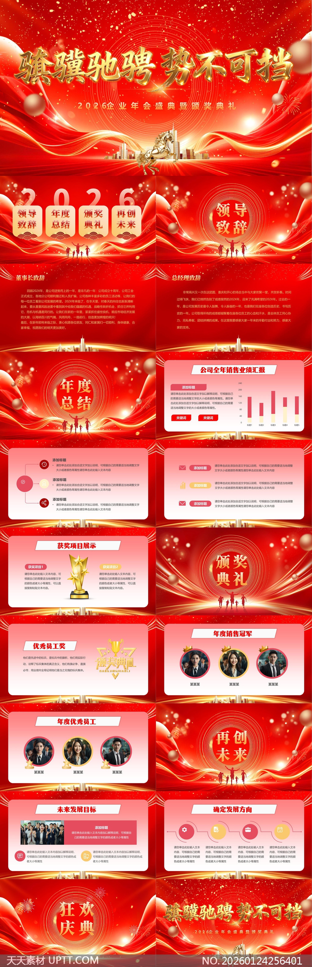 这款PPT模板以炽热红金为主色调,融合奔腾骏马与城市天际线元素,营造出气势磅礴、锐意进取的视觉氛围,专为企业年会盛典及颁奖典礼打造,内含领导致辞、年度总结、业绩汇报、奖项展示、未来规划等完整模块,排版大气专业、图文并茂,可一键替换内容,轻松适配各类大型会议场景,助您高效呈现企业辉煌成就与奋进蓝图。【 素材唯一编号 20260124256401 】,企业宣传类红色风格PPTX格式素材下载,文件格式为.PPTX,下载完成后的文件为一个压缩包,素材压缩包大小34.88 MB,请解压后用相应软件打开。