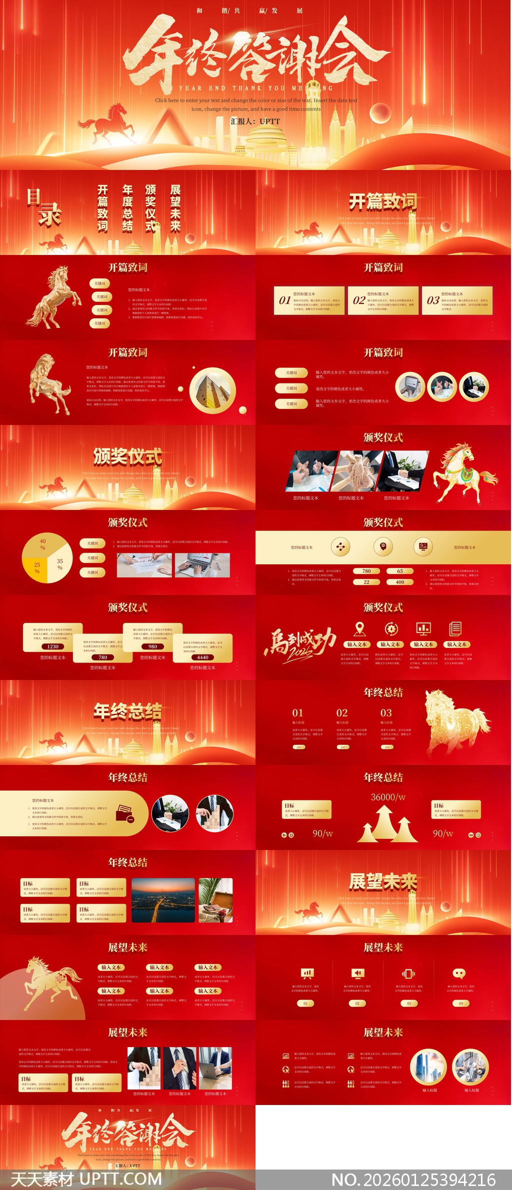 本模板以热烈红金配色营造浓厚喜庆氛围,融合奔腾骏马、城市剪影与光效粒子等视觉元素,凸显活力与成就感;结构清晰覆盖开篇致辞、颁奖仪式、年度总结及未来展望四大模块,适配企业年终答谢会、年度表彰大会及战略发布会等正式场合,兼具专业性与感染力,助力高效呈现团队成果与新年愿景。【 素材唯一编号 20260125394216 】,述职汇报类红色风格PPTX格式素材下载,文件格式为.PPTX,下载完成后的文件为一个压缩包,素材压缩包大小9.28 MB,请解压后用相应软件打开。
