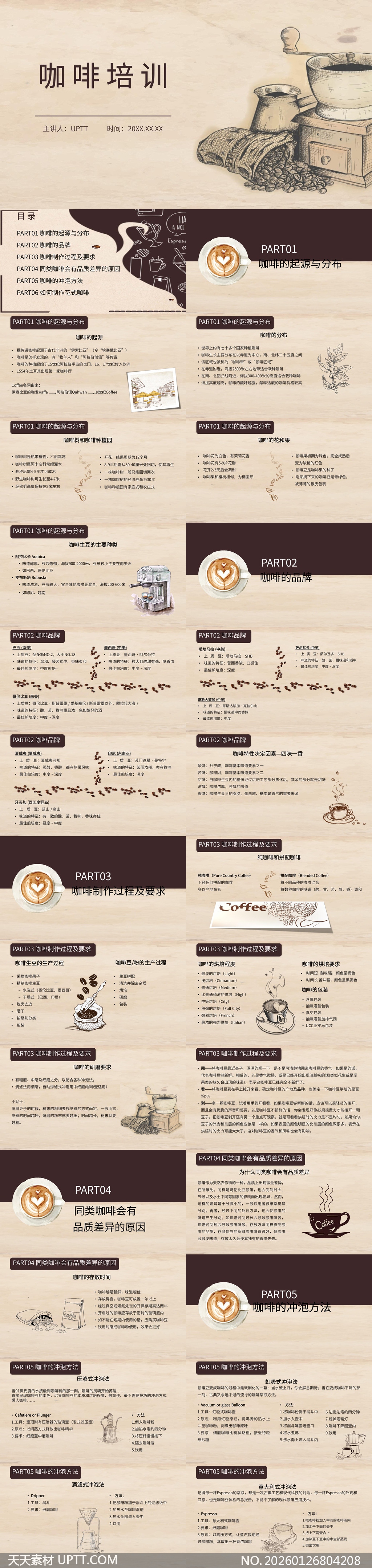 本PPT模板采用复古手绘插画与暖色调木质纹理设计,视觉温馨专业,内容系统涵盖咖啡起源、品种特性、品牌辨识、制作工艺、品质差异及主流冲泡方法六大模块,每页配以清晰图解与关键要点提炼,兼顾知识性与可读性;适用于咖啡师培训、精品咖啡店内部教学、高校饮品课程授课或行业分享会等场景,支持灵活编辑与快速定制,助力讲师高效传递专业知识,提升学员学习体验与记忆深度。【 素材唯一编号 20260126804208 】,企业培训类黄色风格PPTX格式素材下载,文件格式为.PPTX,下载完成后的文件为一个压缩包,素材压缩包大小12.37 MB,请解压后用相应软件打开。