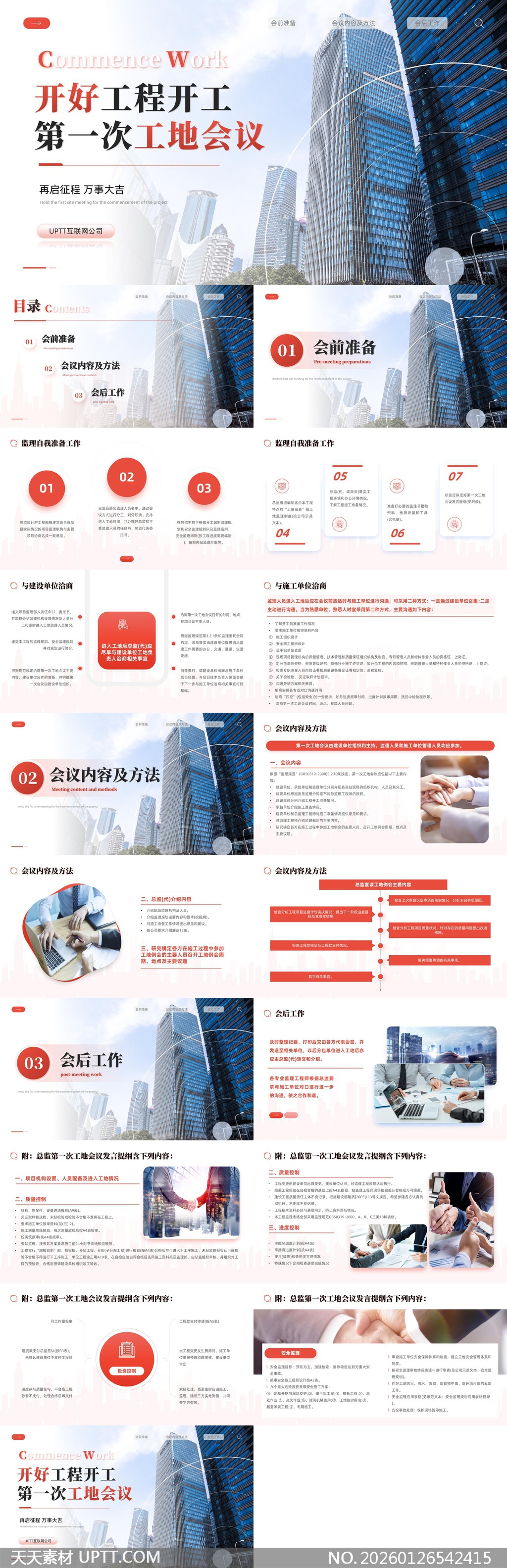 本PPT模板以现代都市建筑为视觉背景,专业呈现工程开工首次工地会议全流程——涵盖会前准备(监理自检、建设单位沟通)、会议核心议程(组织架构、职责分工、质量与安全管控要点)及会后落实(纪要签发、问题跟踪、投资与进度管理),适用于监理单位、施工方及业主方在项目启动阶段高效组织会议、明确责任边界、确保合规落地,提升协同效率与风险预控能力。【 素材唯一编号 20260126542415 】,企业宣传类红色风格PPTX格式素材下载,文件格式为.PPTX,下载完成后的文件为一个压缩包,素材压缩包大小12.66 MB,请解压后用相应软件打开。