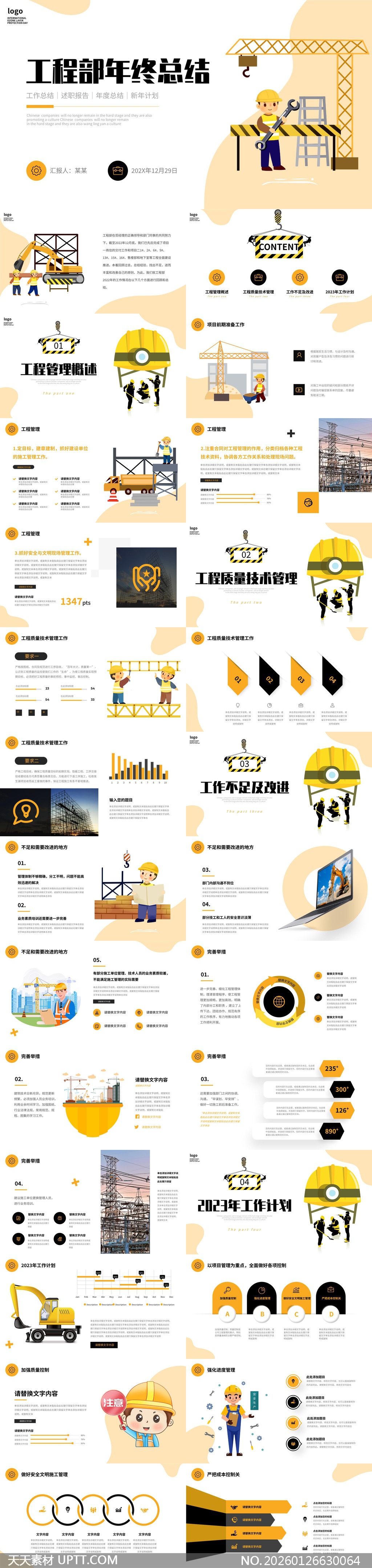 本模板采用明快橙黄主色调搭配工程元素插画,融合卡通工人、塔吊、安全帽等视觉符号,风格专业又不失亲和力;结构清晰划分为管理概述、质量技术、问题改进与新年计划四大模块,内置数据图表、进度条、流程图等可编辑组件,支持一键替换文字与配色;适用于工程部年度述职、项目复盘或跨部门汇报场景,兼顾逻辑性与可视化表达,助力高效呈现工作成果与规划思路。【 素材唯一编号 20260126630064 】,述职汇报类黄色风格PPTX格式素材下载,文件格式为.PPTX,下载完成后的文件为一个压缩包,素材压缩包大小11.77 MB,请解压后用相应软件打开。