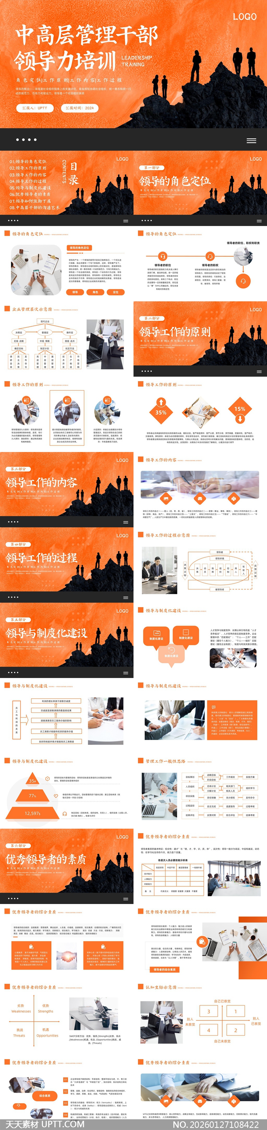 本PPT模板以橙黑主色调营造专业、进取的视觉氛围,融合山峰剪影与职场实拍图,强化领导力“登高望远”的意象;内容结构清晰覆盖角色定位、工作原则、过程管理、制度建设及素质模型五大模块,嵌入SWOT分析、认知坐标图、流程图等10余种实用图表;适用于企业内训、高管研修、后备干部培养等场景,支持快速定制修改,助力培训师高效呈现系统化领导力课程体系。【 素材唯一编号 20260127108422 】,企业培训类橙色风格PPTX格式素材下载,文件格式为.PPTX,下载完成后的文件为一个压缩包,素材压缩包大小33.38 MB,请解压后用相应软件打开。
