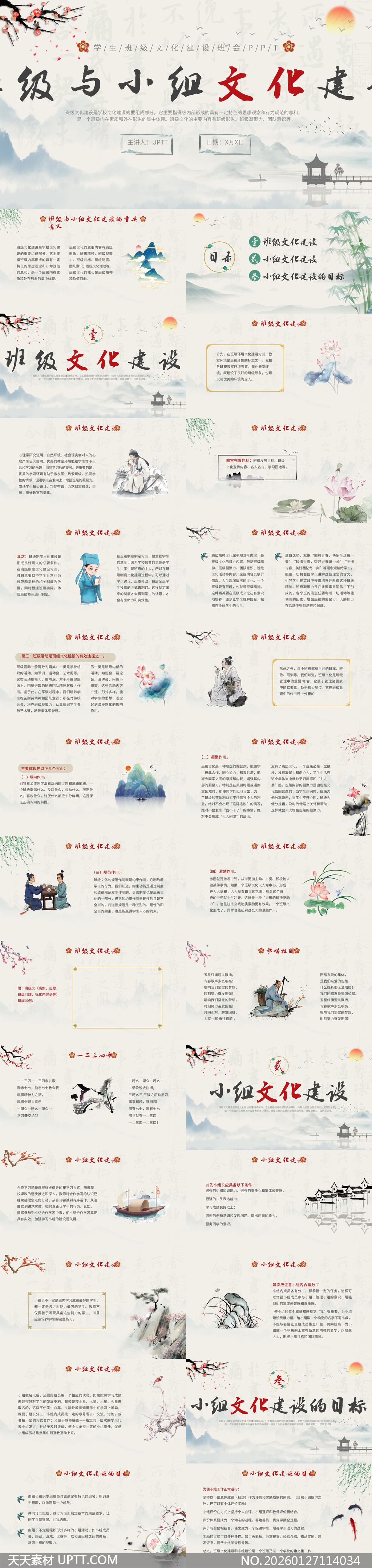 本模板以水墨丹青、亭台楼阁、梅兰竹菊等经典中国风元素为视觉基调,融合古籍排版与现代信息层级设计,呈现雅致而不失实用的视觉风格;内容涵盖班级文化内涵阐释、小组建设路径、目标设定与活动方案等模块,配以手绘人物插画与诗意文案,强化文化浸润感;适用于中小学班主任培训、班会课件、德育汇报及校园文化建设展示等场景,助力教师高效构建有温度、有底蕴、有凝聚力的集体精神家园。【 素材唯一编号 20260127114034 】,企业培训类绿色风格PPTX格式素材下载,文件格式为.PPTX,下载完成后的文件为一个压缩包,素材压缩包大小47 MB,请解压后用相应软件打开。