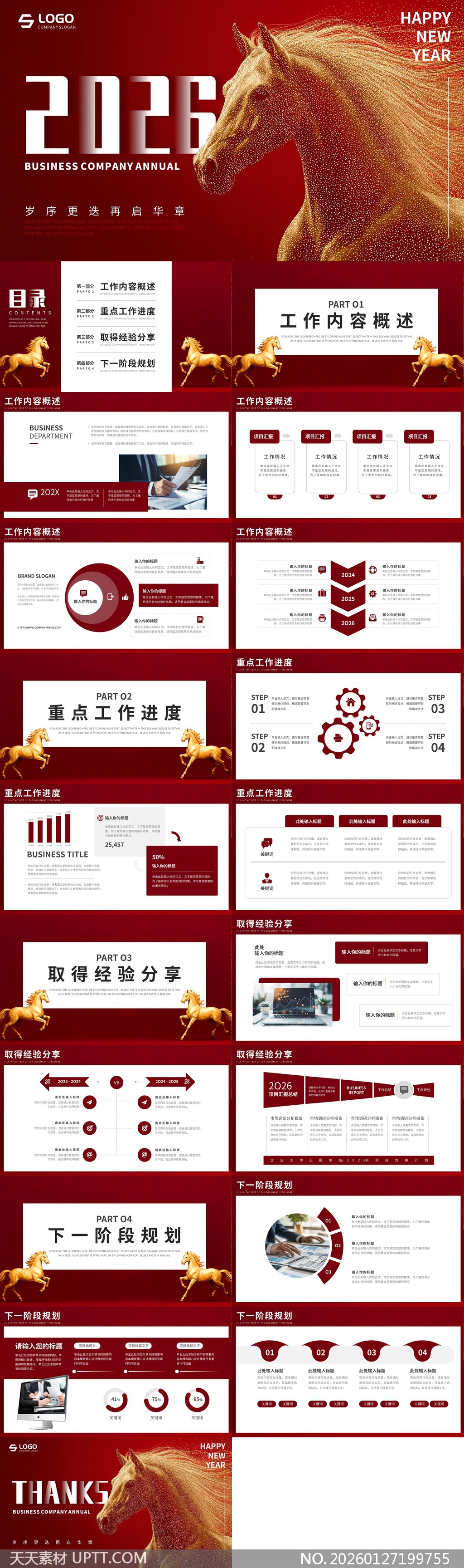 本模板以2026甲辰龙年(注:标题“马年”为误标,实际2026为龙年)为主题,采用浓郁中国红与鎏金骏马元素营造喜庆庄重氛围,融合现代扁平化设计与传统节庆意象;内含工作概述、重点进展、经验复盘与未来规划四大核心模块,适用于企业年终总结、部门述职、高管汇报及新年启动会等正式场合,兼具视觉冲击力与信息传达效率,助力团队高效呈现年度成果与战略蓝图。【 素材唯一编号 20260127199755 】,企业宣传类红色风格PPTX格式素材下载,文件格式为.PPTX,下载完成后的文件为一个压缩包,素材压缩包大小3.31 MB,请解压后用相应软件打开。