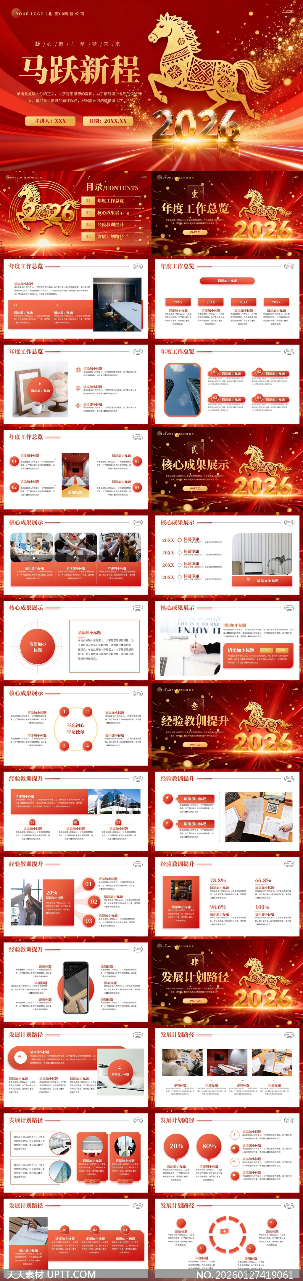 马跃 新程 企业 年度总结 2026模板 金色骏马 商业演示 工作汇报 红金配色 马年主题 企业年终总结