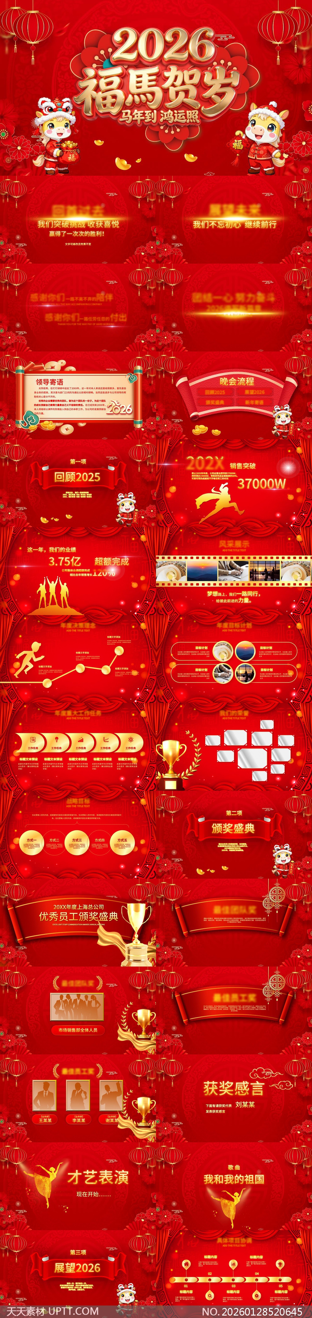 本模板融合2026丙午马年生肖元素与传统灯笼、祥云、锦鲤等吉祥符号,搭配Q版福马IP形象,营造浓厚节日氛围;涵盖年度回顾、目标规划、颁奖盛典、才艺展示与未来展望五大模块,内置数据图表、流程图、照片墙、奖杯展台等实用版式,适用于企业年终总结大会、春节联欢晚会及优秀员工表彰仪式等场景,助力高效呈现成果、凝聚团队士气,传递“福马贺岁·鸿运当头”的美好愿景。【 素材唯一编号 20260128520645 】,企业宣传类红色风格PPTX格式素材下载,文件格式为.PPTX,下载完成后的文件为一个压缩包,素材压缩包大小43.15 MB,请解压后用相应软件打开。