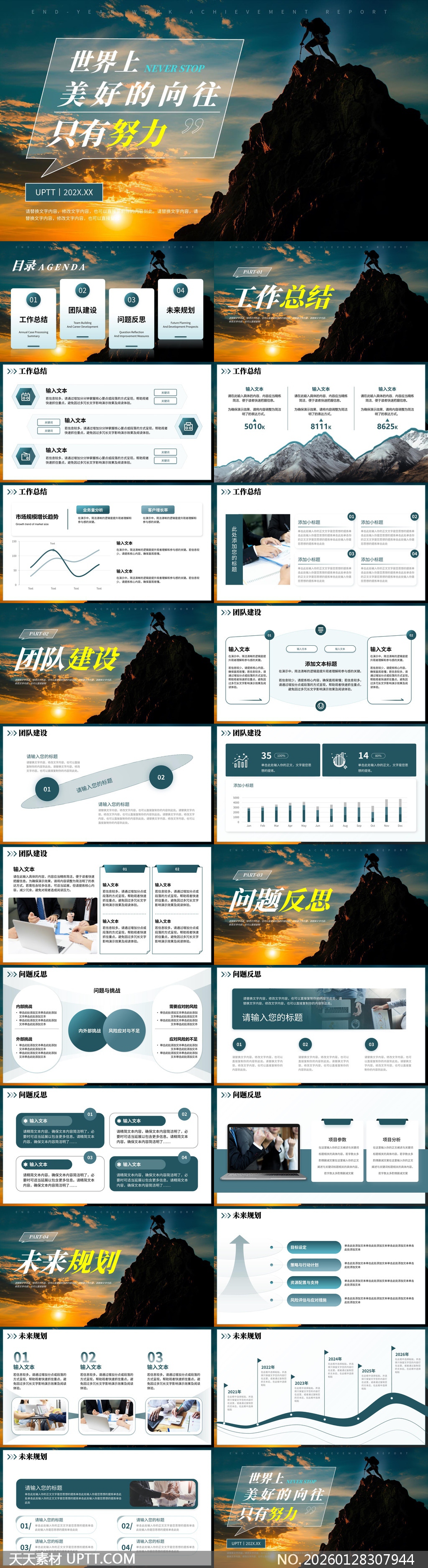 本PPT模板以壮丽山峰剪影与温暖日出为视觉基调,融合现代扁平化设计与动态数据图表,营造出昂扬奋进的励志氛围;内含工作总结构架、团队建设互动模块、问题反思深度分析及未来规划时间轴等四大核心板块,适用于企业年度复盘汇报、跨部门协作会议、新财年战略部署及员工激励培训等多元场景,助力团队凝聚共识、明确方向、激发潜能,实现从总结到跃升的无缝衔接。【 素材唯一编号 20260128307944 】,工作总结类橙色风格PPTX格式素材下载,文件格式为.PPTX,下载完成后的文件为一个压缩包,素材压缩包大小12.9 MB,请解压后用相应软件打开。