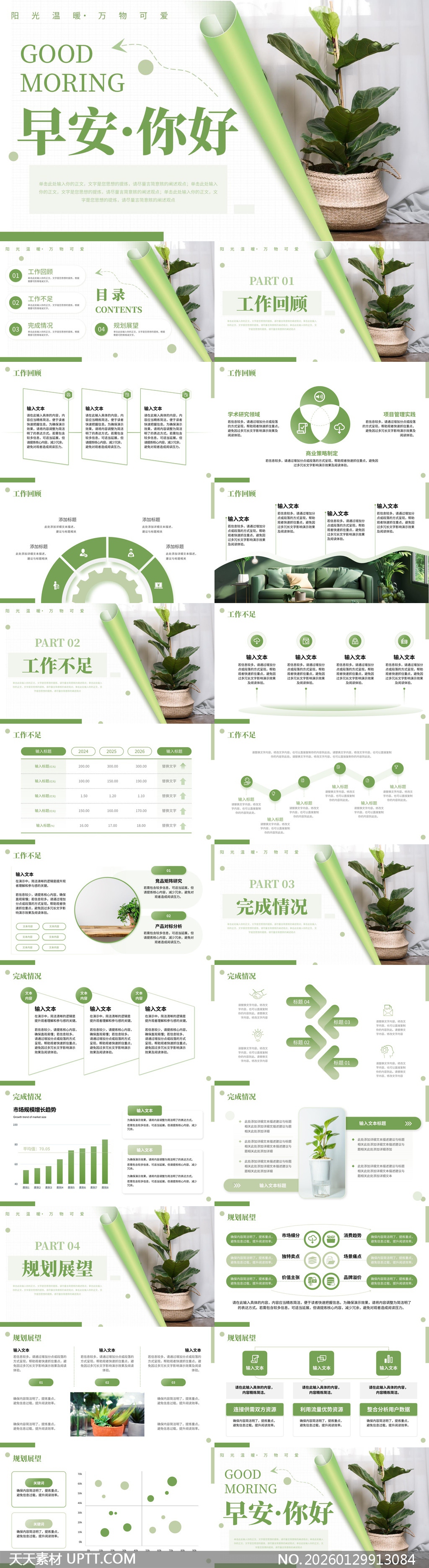 本模板以清新自然的绿色系为主调,融合真实绿植摄影与简约几何图形,营造出舒缓治愈的视觉氛围;内含工作回顾、不足分析、成果展示与未来规划四大核心模块,搭配环形图、时间轴、数据图表及图标化排版,兼顾逻辑性与美观度;适用于季度/年度总结汇报、部门复盘、项目提案及新年度战略规划等场景,尤其适合教育、环保、文创、健康行业用户,既提升专业质感又传递积极向上的组织文化气息。【 素材唯一编号 20260129913084 】,企业宣传类绿色风格PPTX格式素材下载,文件格式为.PPTX,下载完成后的文件为一个压缩包,素材压缩包大小5.91 MB,请解压后用相应软件打开。